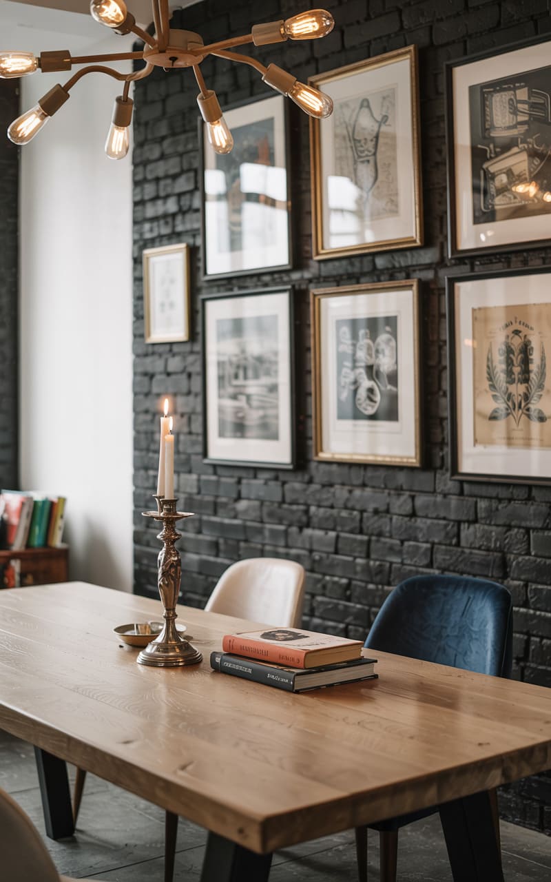 The dining area, a study in contrasts, featured a long, unadorned wooden table, its smooth surface a warm counterpoint to the charcoal-hued brick wall behind. A constellation of framed prints, each a monochromatic whisper, marched across the wall, adding a touch of curated chaos. Above, a spiky chandelier, its bare bulbs glowing warmly, cast an intimate light, drawing attention to a solitary candle flickering in a brass holder. The room, though industrial in its bones, held a quiet elegance, a space where stories could be shared and secrets whispered under the soft, ambient illumination.