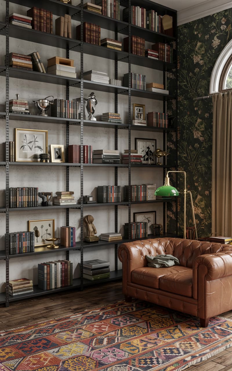 This room emanates a quiet, scholarly air, where the stark lines of industrial shelving, packed with the weight of countless volumes, meet the lived-in comfort of a worn leather Chesterfield. A patterned rug, its colors muted yet vibrant, anchors the space, while a whimsical green lamp casts a soft glow, illuminating the treasures nestled amongst the books. A hint of faded floral wallpaper, glimpsed beyond the shelves, adds a touch of bohemian charm to the otherwise structured, almost monastic atmosphere, suggesting a space where intellectual pursuits and personal passions intertwine.