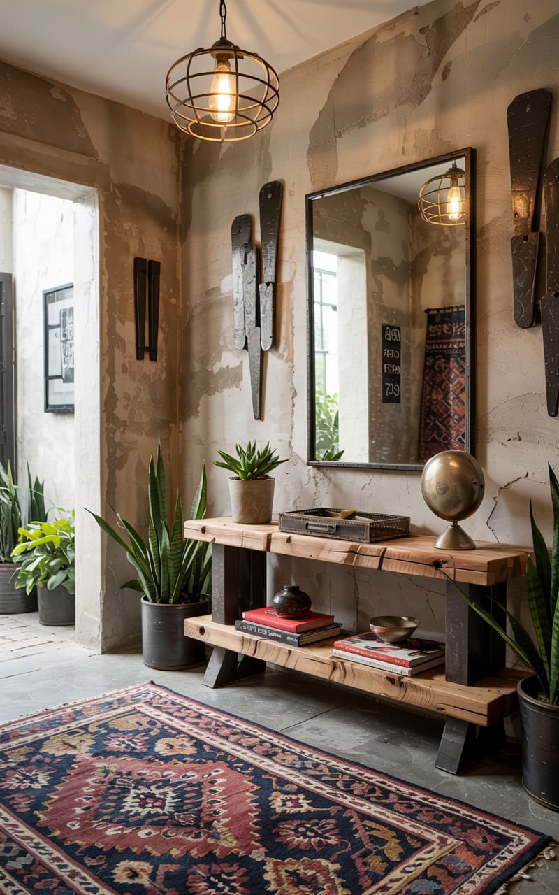 187. Industrial Entryway with Distressed Walls, Maximalist Rug, and Sculptural Hooks