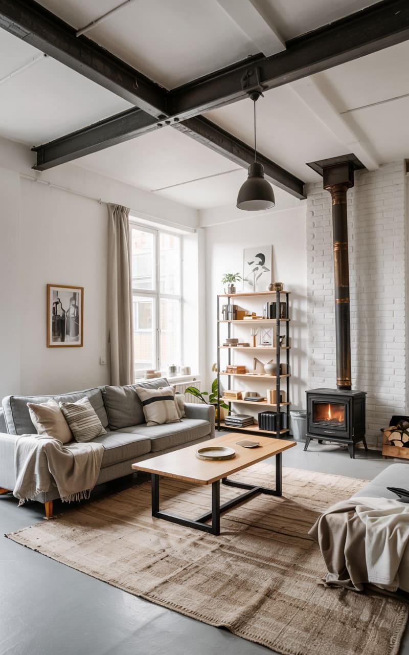 The room hums with a quiet, modern energy, where exposed steel beams carve geometric shadows across the pristine white walls, a stark contrast to the plush grey sofa and the warm, woven rug beneath. A wood-burning stove stands sentinel, its chimney a dark, sculptural line against the whitewashed brick, promising cozy warmth in a space that balances minimalist chic with a touch of rustic comfort. The simple lines of the furniture and the open shelving unit suggest a life lived with intention, a curated collection of objects against the backdrop of industrial bones.