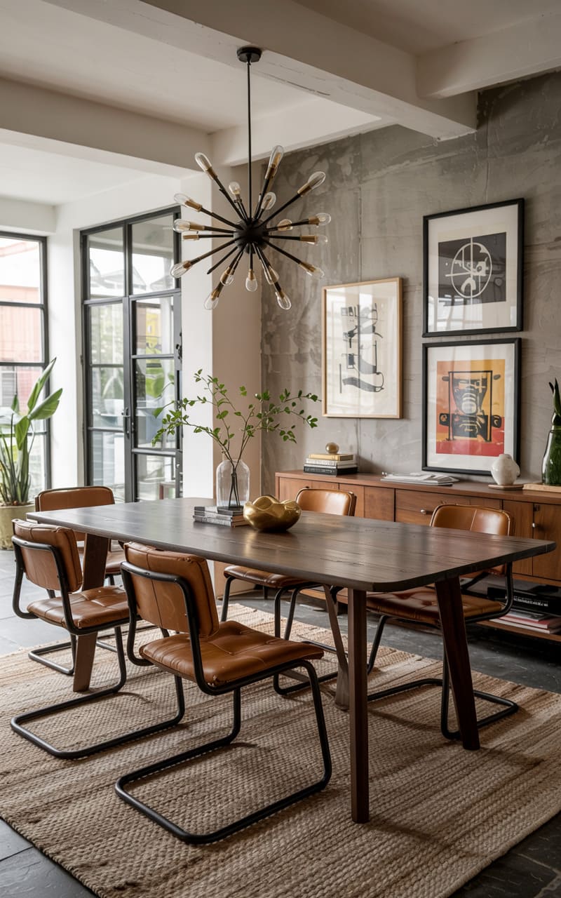 184. Industrial Dining Room with Gallery Wall, Sculptural Lighting, and Mismatched Chairs