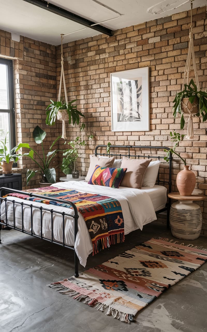 This bedroom is a bohemian rhapsody in brick and steel, a collision of raw industrial charm and vibrant, worldly textiles. A simple iron bed frame anchors the space, its stark lines softened by a riot of color in the woven throw and pillows, while lush greenery cascades from macrame hangers, injecting life into the room’s urban edginess. The polished concrete floor grounds the scene, a cool counterpoint to the warm, textured brick wall, creating a sanctuary that feels both curated and comfortably lived-in.