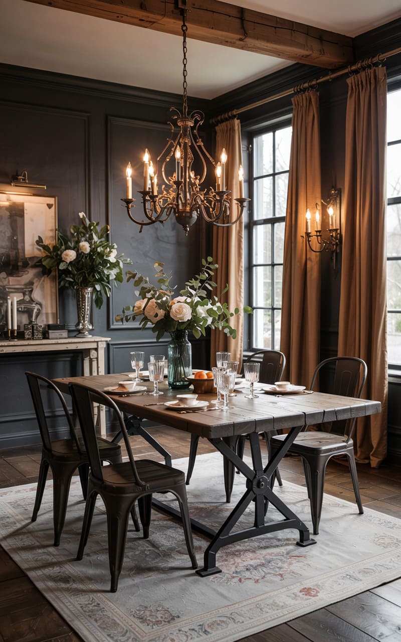 A moody elegance settles over this dining space, where charcoal walls deepen the drama and a rustic wooden table, supported by iron crossbeams, anchors the room. A vintage chandelier, its candelabra arms casting a warm, flickering glow, hangs above, echoing the wall sconces that flank the tall windows draped in heavy taupe curtains. Flowers in glass vases soften the room’s hard edges, while metal chairs, their simple lines a nod to industrial design, surround the table, hinting at shared meals and intimate gatherings.