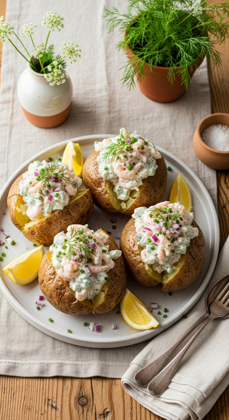 - Classic Swedish comfort: crisp-skinned baked potatoes piled high with creamy, lemony dill shrimp.