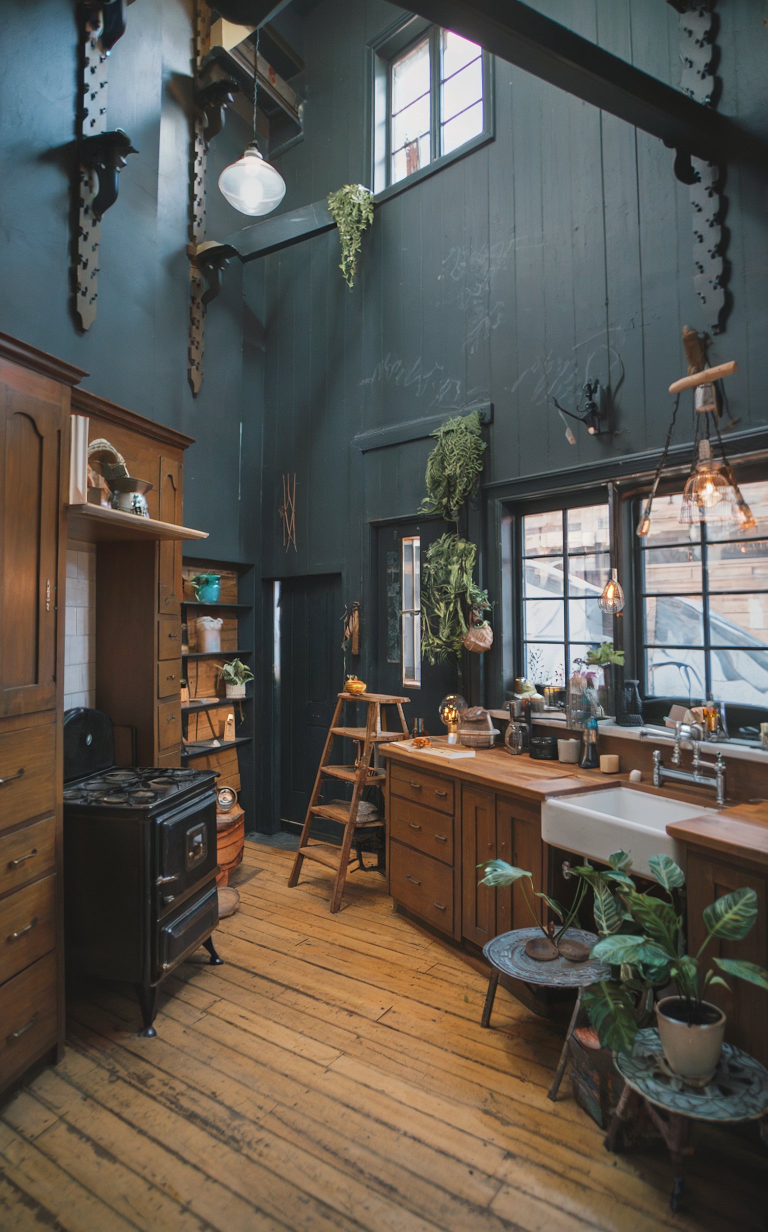 This enchanting bohemian kitchen marries rustic warmth with Victorian industrial elements, featuring soaring hunter green walls that create a dramatic backdrop for warm wood cabinetry, a vintage cast iron stove, and a farmhouse sink, all grounded by original pine flooring. The space comes alive with cascading plants, industrial glass pendant lighting, and thoughtfully curated vintage pieces like the wooden ladder and antique storage solutions, creating an artistic workspace that feels both historically authentic and wonderfully lived-in.