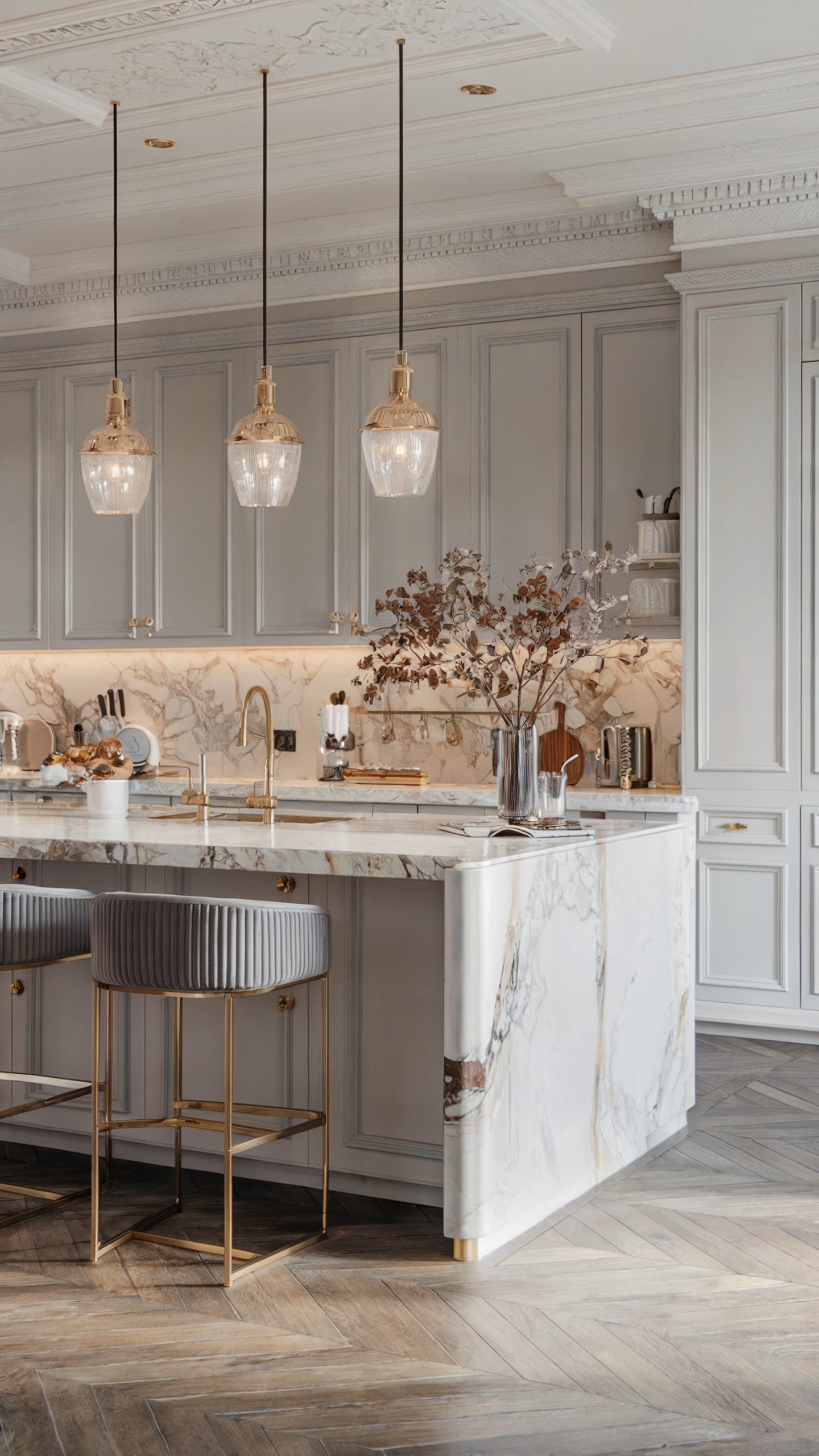 This sophisticated Parisian-inspired kitchen showcases a harmonious blend of soft grey paneled cabinetry with dramatic Calacatta marble countertops and backsplash, featuring delicate gold veining that’s beautifully complemented by brushed brass fixtures and hardware. The space is illuminated by three statement glass and brass pendant lights that hang beneath an ornate ceiling with intricate crown molding and detailed plasterwork, creating an atmosphere of refined luxury. Modern elements are thoughtfully integrated through contemporary grey ribbed barstools with brass frames and bleached herringbone flooring, while the backlit marble backsplash adds a subtle glow that enhances the natural stone’s movement and creates an ethereal ambiance.