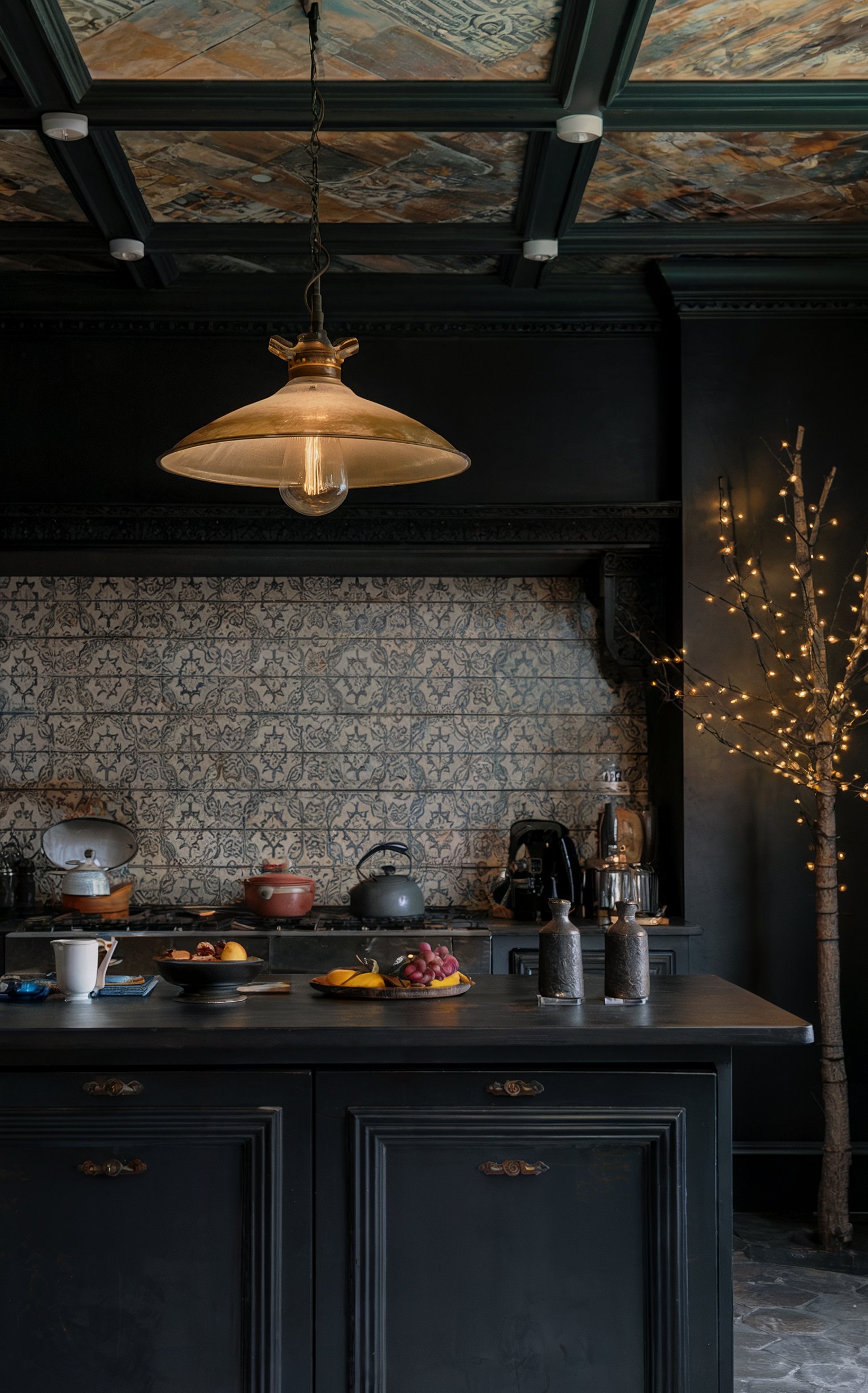 This moody, Victorian-inspired kitchen makes a dramatic statement with its deep charcoal cabinetry and ornate tin ceiling tiles in weathered copper tones, while a vintage-inspired brass pendant light casts a warm glow over the space. The intricate patterned tile backsplash in grey and white adds romantic sophistication, beautifully contrasting with the rustic elements like earthenware vessels and the whimsical touch of a illuminated branch, creating an atmosphere that feels both historically rich and intimately cozy.