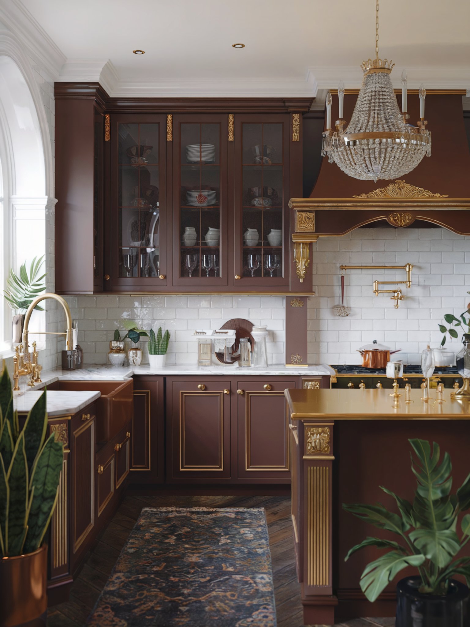 This regal kitchen exudes timeless luxury with its rich chocolate-brown cabinetry adorned with gold gilt accents, crystal empire chandelier, and classic marble countertops set against a pristine white subway tile backsplash. The space masterfully balances ornate details like the carved range hood and brass pot filler with modern elements, while strategic placement of monstera plants and other tropical greenery softens the formal aesthetic, all anchored by a stunning blue-toned runner laid over herringbone hardwood floors.