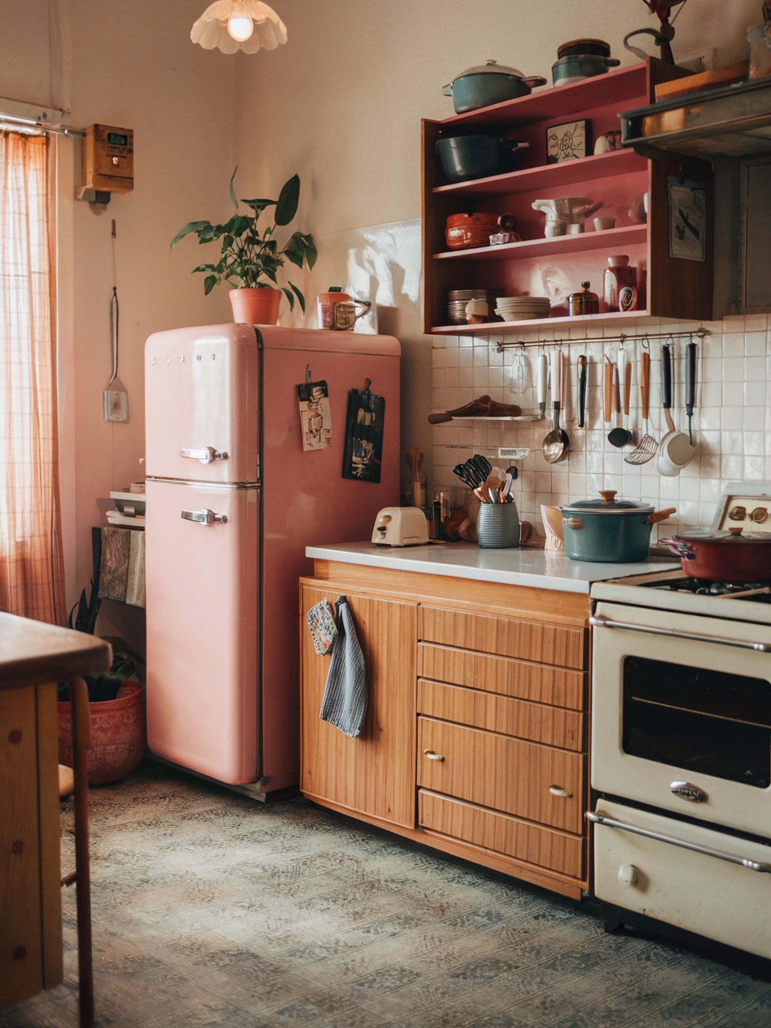 This kitchen is a delightful throwback to the mid-century modern era. The soft pink refrigerator and warm wood cabinets create a cozy and inviting atmosphere. The open shelving displays a curated collection of colorful cookware and utensils, adding a touch of personality. The overall aesthetic is both nostalgic and fresh, making this kitchen a charming space to cook and gather.