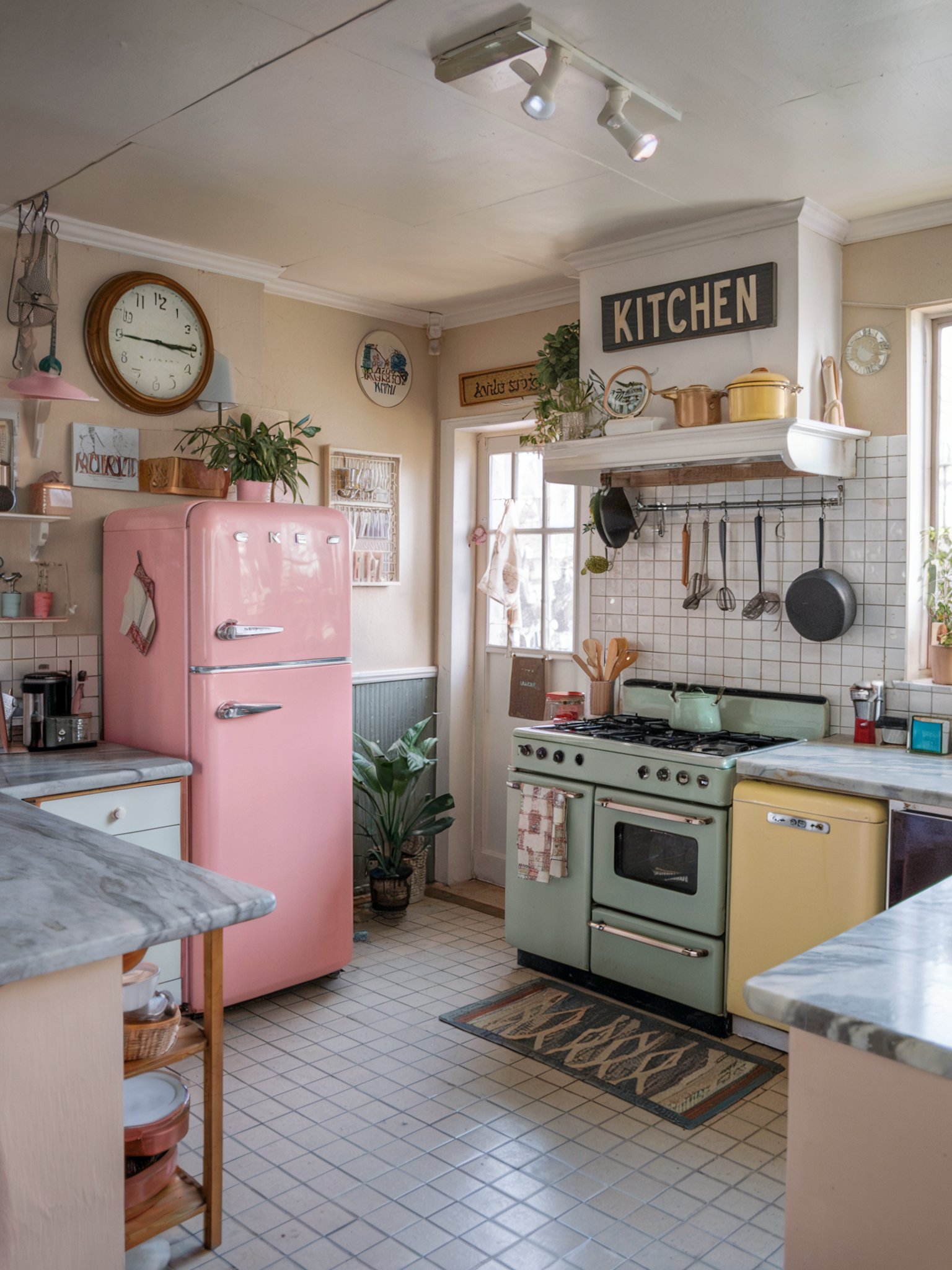 This kitchen exudes a charming vintage aesthetic with its pastel-colored appliances and classic subway tile backsplash. The pops of greenery and vintage accents add warmth and personality to the space. The overall effect is a cozy and inviting kitchen that feels both nostalgic and modern.