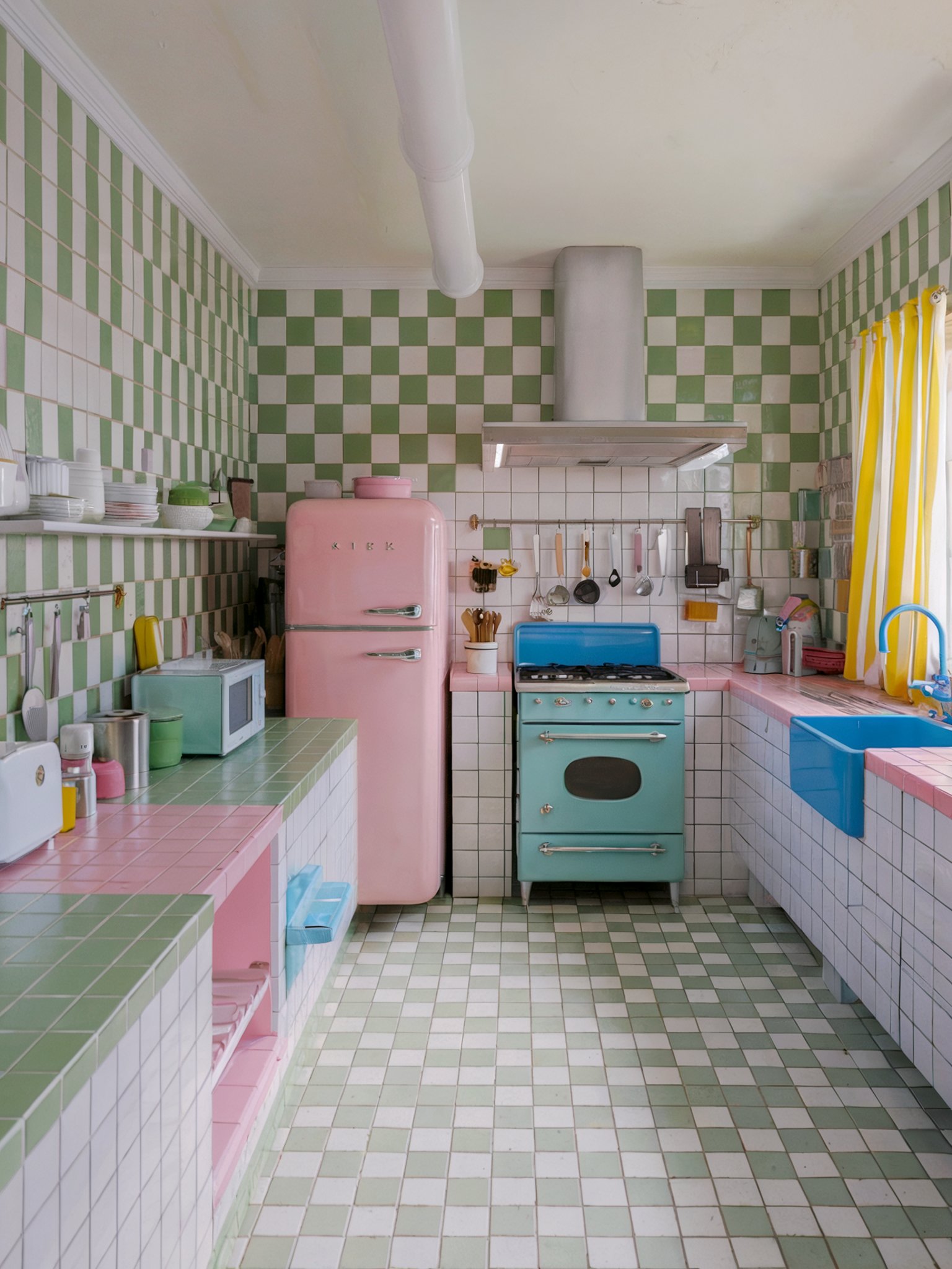 This charming retro kitchen masterfully embraces a playful pastel palette with a pink SMEG refrigerator, mint green stove, and turquoise accents, all set against a striking checkerboard pattern of green and white tiles that extends from the walls to the floor. The space perfectly captures the essence of 1950s nostalgic design while maintaining a fresh, whimsical appeal through its thoughtful color blocking and vintage appliance choices, complete with practical touches like the stainless steel range hood and wall-mounted utensil rack.