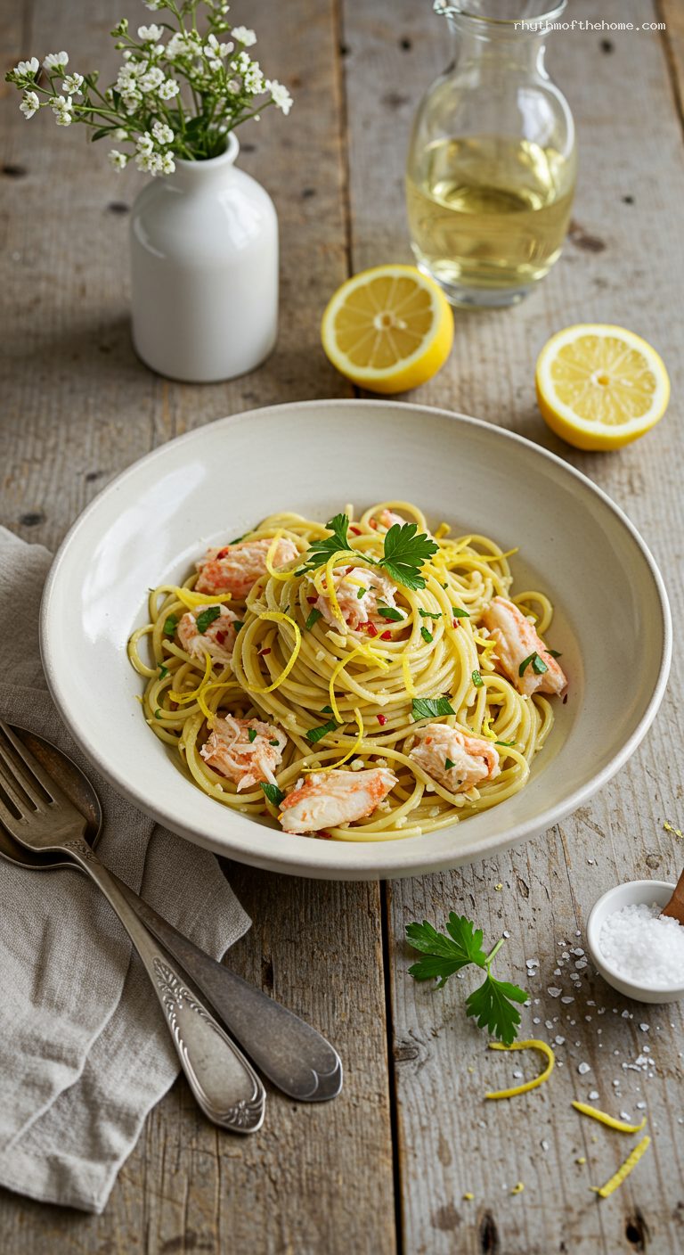 This pasta is best enjoyed immediately. If needed, refrigerate leftovers in an airtight container for up to 1 day. Reheat gently in a skillet over low heat with a splash of water and a drizzle of olive oil until just warmed—avoid overcooking or the crab may toughen. You can prep ahead by slicing garlic, chopping parsley, and zesting the lemon up to 1 day in advance; store separately, covered and chilled.