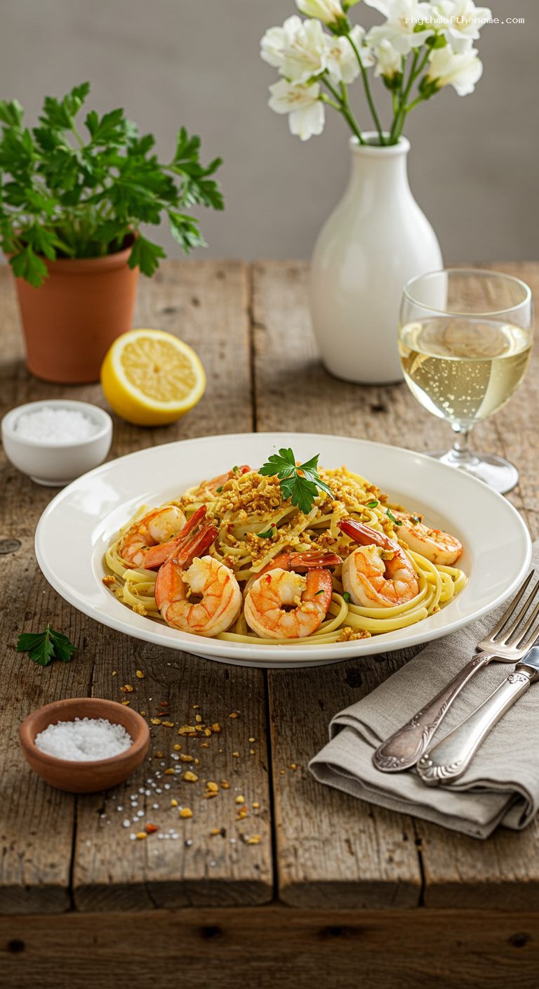 - 6. Toss linguine and shrimp in sauce 1–2 minutes; add parsley, adjust with pasta water, top with crunchy breadcrumbs and serve.
