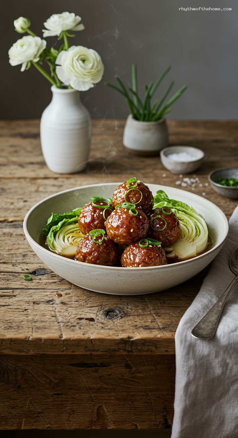 - 7. Toss meatballs in glaze 1–2 minutes; serve over braised napa with extra broth and scallion greens.