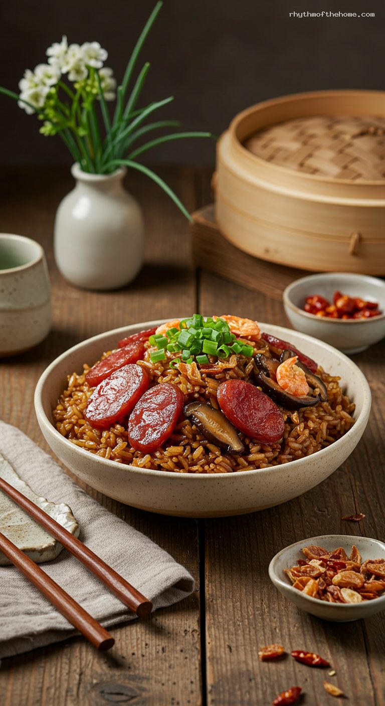 • Pantry: Glutinous (sticky) rice, dried shiitake mushrooms, dried shrimp, Chinese sausages (lap cheong), light soy sauce, dark soy sauce, oyster sauce, Shaoxing wine, white pepper, toasted sesame oil, neutral oil, sugar, optional fried shallots or chili crisp