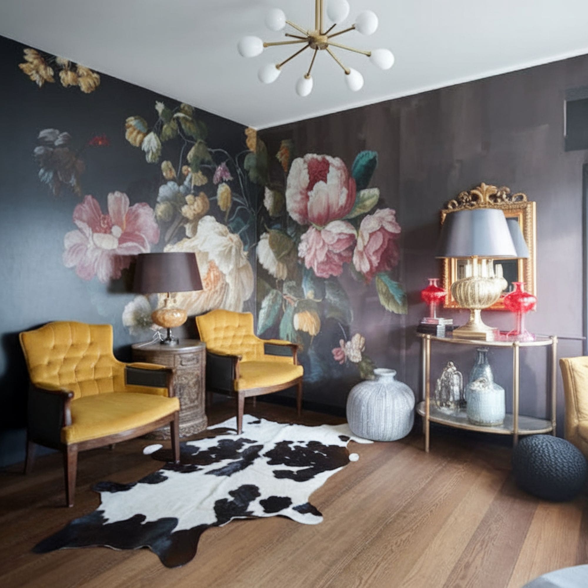 A quick and effective method for embracing maximalism is to choose a fabulous wallpaper full of vibrant colors to bring the room to life. Anyone stepping into your living room will immediately notice an appealing wallpaper like this model here that relies on a colorful floral pattern that’s even more striking due to the contrast with the black walls. This is a baroque-style mural that adds great maximalist vibes to this luxurious home office.
