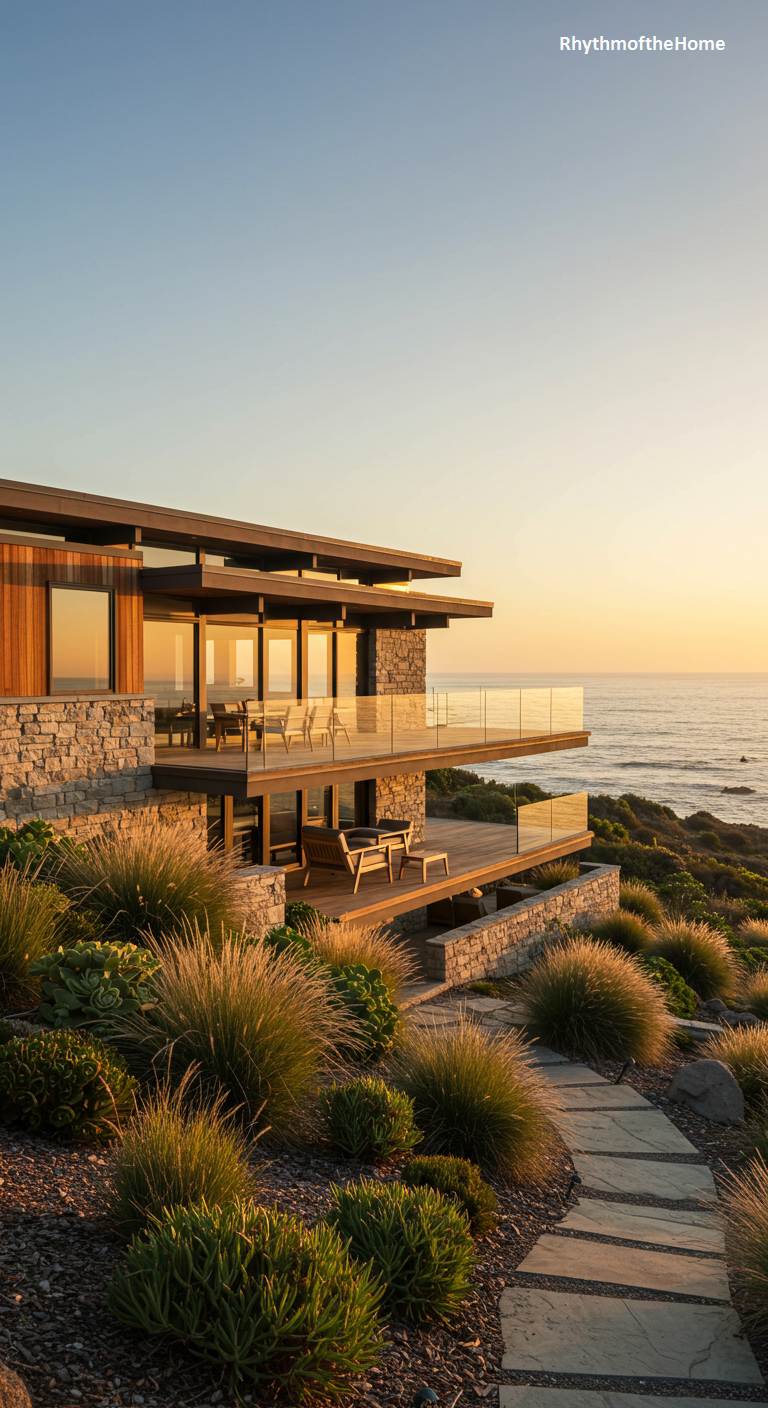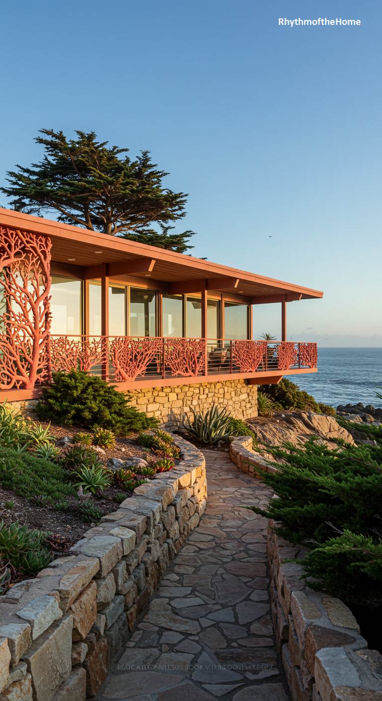 This stunning coastal Mid-Century home features a truly unique and artistic architectural element. The balcony railing is a custom, laser-cut metal screen with an intricate, organic pattern reminiscent of coral or tree branches, painted a vibrant coral-pink. This artistic feature provides a spectacular contrast to the home’s clean lines, wood-framed glass walls, and stone foundation. Perched on a cliff overlooking the ocean, with a stone path winding through coastal vegetation, this residence is a breathtaking work of art that celebrates its incredible natural setting at sunset.
