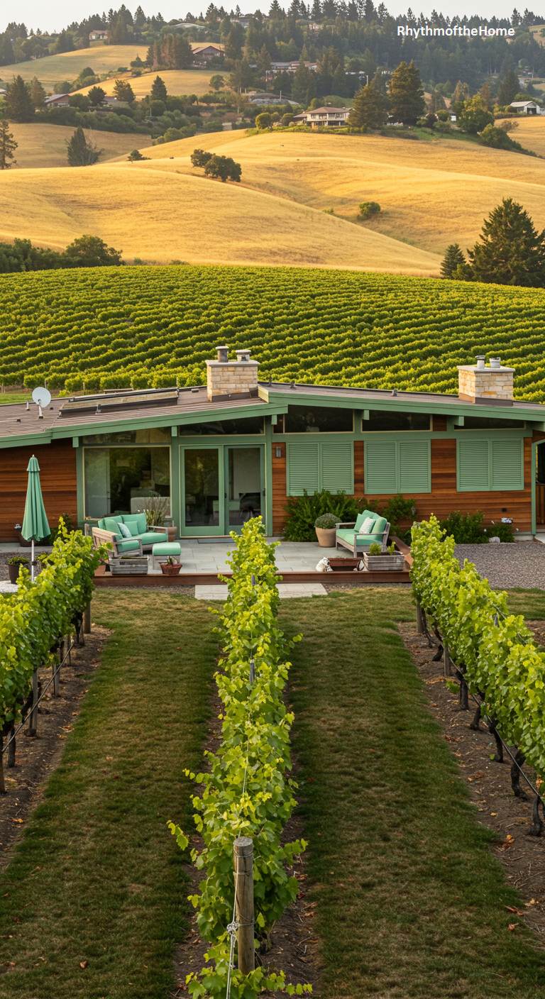 This beautiful single-story Mid-Century home enjoys a privileged position nestled within a picturesque vineyard. The house itself features warm wood siding and a green roof, with mint-green shutters that complement the lush surroundings. A spacious stone patio with comfortable, color-coordinated outdoor furniture offers the perfect spot to relax and take in the stunning views of the rolling hills and endless rows of grapevines. This is an idyllic retreat where the clean lines of modern architecture meet the rustic, romantic beauty of wine country.