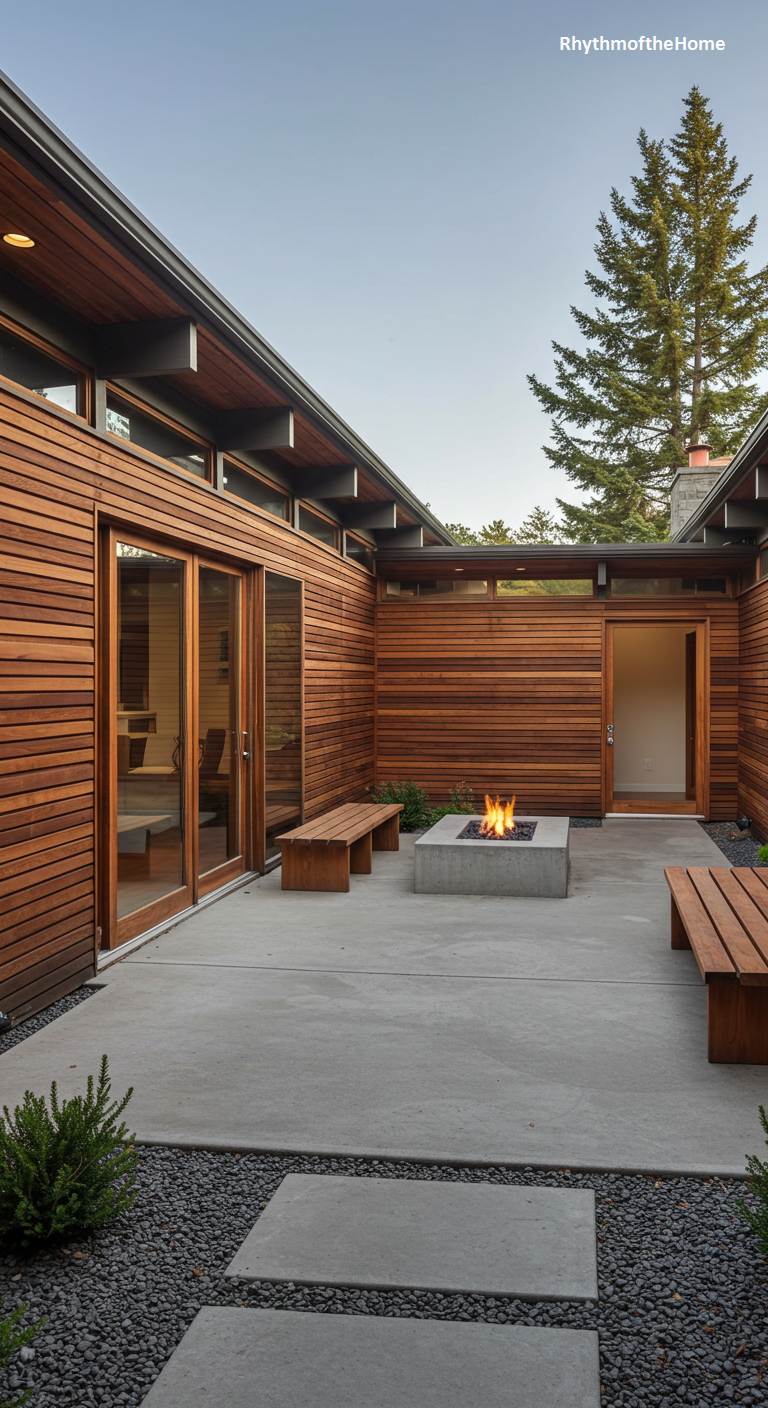 This intimate courtyard, enclosed by the warm, horizontal cedar siding of a U-shaped Mid-Century home, is the very definition of a private outdoor room. The space is minimalist yet inviting, centered around a modern, square concrete fire pit with a lively flame. Simple wooden benches offer seating, their clean lines complementing the home’s architecture. The ground is a tasteful mix of smooth concrete patio and dark river stones, while clerestory windows above promise light-filled interiors. An evergreen tree in the corner adds a touch of verticality and life to this tranquil, sheltered gathering spot.