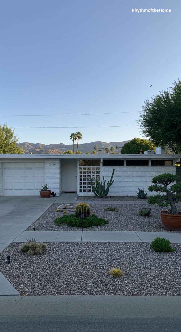 This crisp, white-painted brick Mid-Century home offers a cool and clean contrast to the sun-drenched desert environment. Its classic low-slung, flat-roofed silhouette is a hallmark of the era, while a decorative, geometric breeze block screen adds a touch of iconic flair and visual interest by the entrance. The landscaping is a study in drought-tolerant design, with a gravel yard featuring a variety of cacti and a beautifully sculpted bonsai tree in a large pot. In the distance, palm trees and mountains rise against a clear blue sky, perfectly framing this stylish desert dwelling.