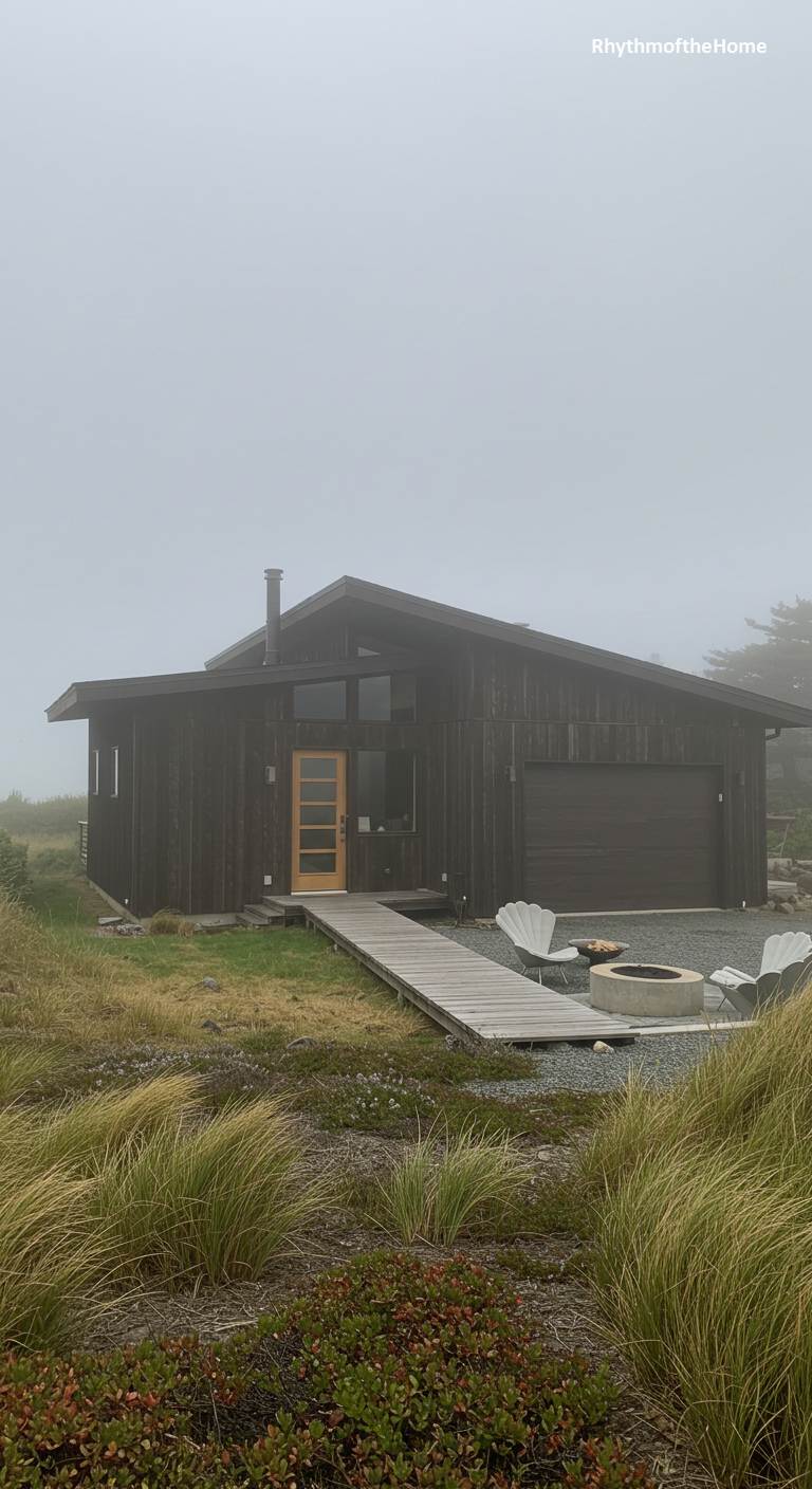 Shrouded in a thick, atmospheric coastal fog, this dark-stained Mid-Century home possesses a moody and mysterious beauty. The simple, angular form with its shed-style roof and integrated garage speaks to a functional, unpretentious modernism. A light-wood front door provides a warm, welcoming contrast to the dark exterior. A wooden boardwalk leads to the front entrance across a yard of wild coastal grasses and native groundcover, suggesting a deep connection to its rugged, untamed surroundings. This is a home that embraces the elemental and often dramatic weather of the shoreline.