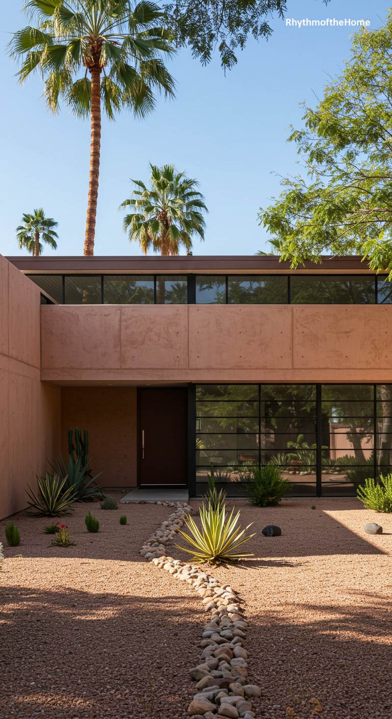 This two-story Mid-Century home utilizes a warm, terracotta-colored stucco that resonates beautifully with its desert setting. The architecture is a composition of stacked, blocky forms, with a band of clerestory windows on the upper level and large glass panels below, shaded by the deep overhang of the second floor. The xeriscaped yard is simple and effective, featuring gravel groundcover and a mix of agave and other succulents. A meandering line of smooth river stones creates a dry creek bed, adding a sculptural, organic element to the otherwise rectilinear design.