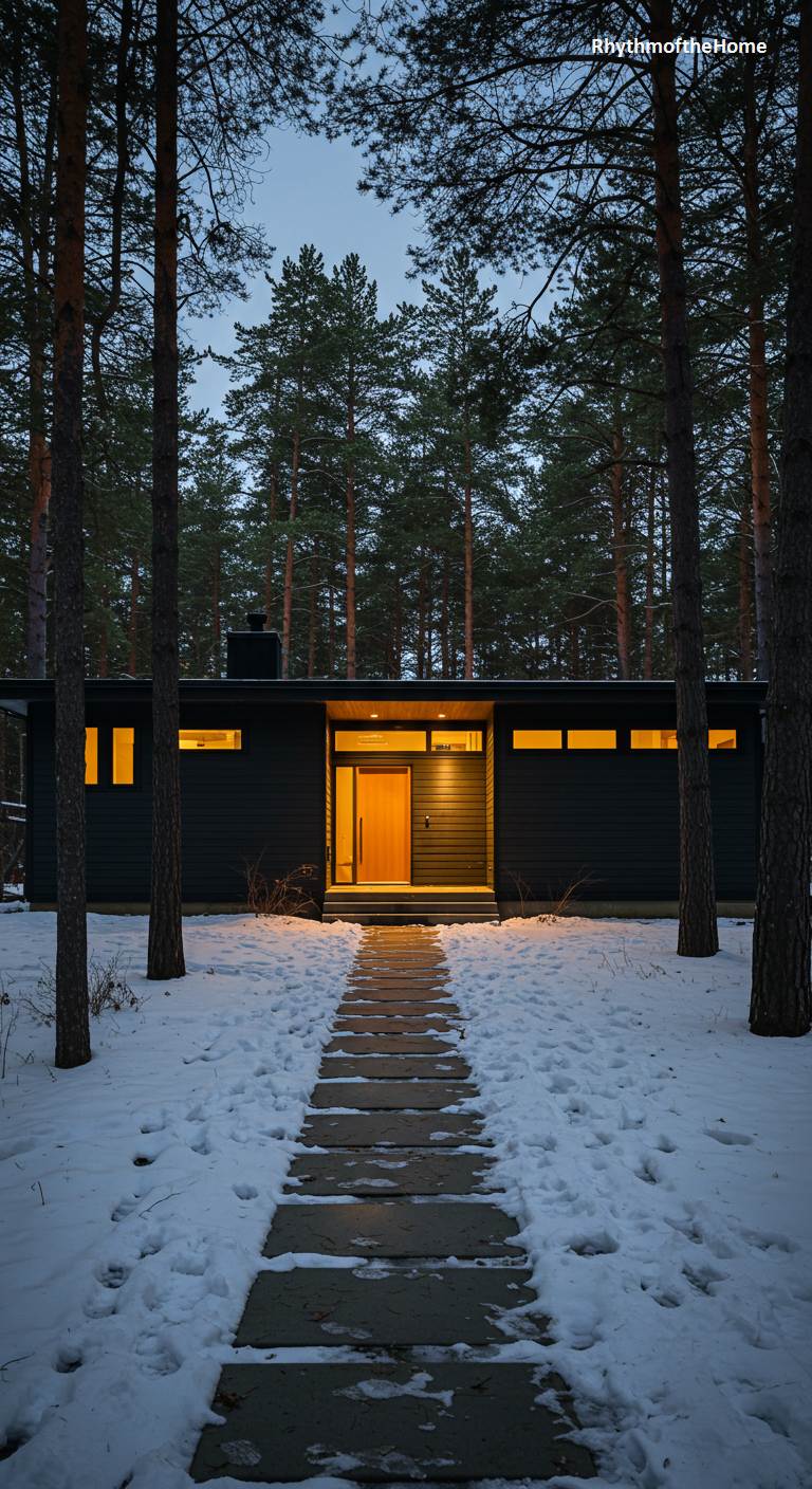 A path of simple concrete pavers cuts through a fresh blanket of snow, leading to the warm, inviting glow of this secluded Mid-Century home. Tucked amongst tall, slender pine trees, the house presents a low, horizontal profile, its dark exterior standing in stark contrast to the white winter landscape. A recessed entryway, paneled in warm wood and brightly lit, acts as a welcoming beacon in the cool twilight. The minimalist design, with its clean lines and ribbon-like windows, emphasizes a quiet, harmonious existence with its serene, snow-covered forest surroundings.