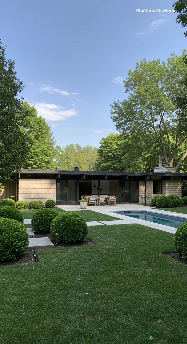 This elegant, U-shaped Mid-Century home creates a private paradise in its backyard, centered around a pristine swimming pool. The architecture is characterized by a flat roof, dark trim, and walls of sliding glass doors that open up to a covered patio perfect for al fresco dining. The lush green lawn is intersected by a grid of large white concrete pavers, creating a strong geometric pattern that extends from the house to the pool. Manicured, spherical shrubs continue this theme of clean geometry, resulting in a sophisticated and orderly landscape that is both modern and timeless.