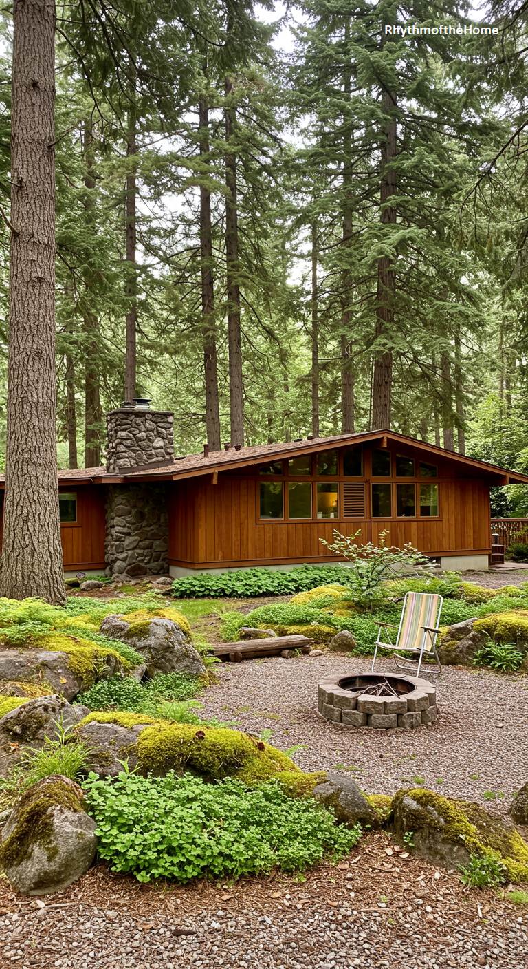 Nestled deep within a tranquil forest of towering pines, this quintessential Mid-Century cabin exudes a rustic, organic charm. Its warm, horizontal wood siding and a formidable fieldstone chimney anchor it to the earth, while clerestory windows just below the low-pitched roofline invite slivers of daylight inside. The surrounding landscape is a serene composition of moss-draped boulders and native groundcover, leading to a simple gravel patio. A lone, colorfully striped chair sits expectantly beside a stone fire pit, suggesting quiet moments of contemplation and a deep, harmonious connection with nature.