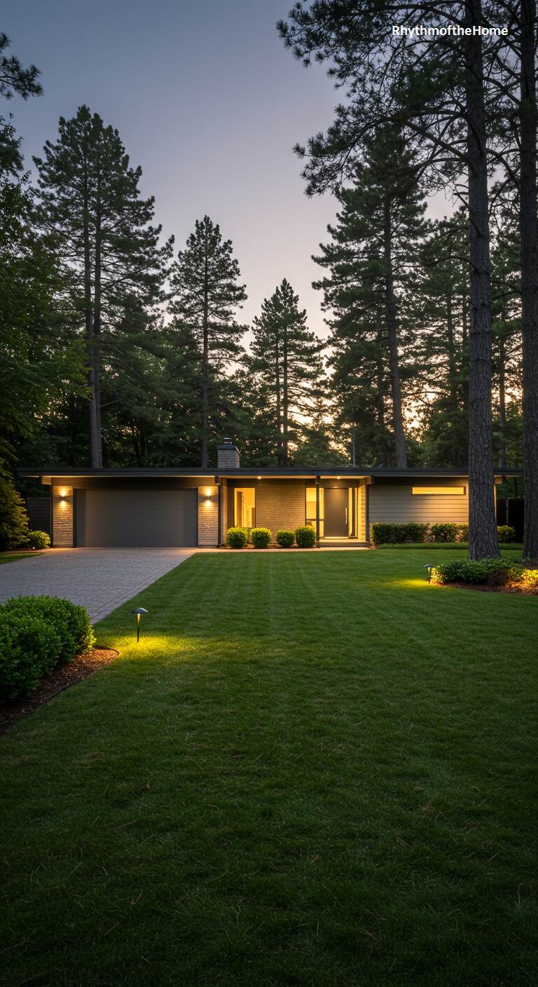 As twilight descends, this immaculate single-story Mid-Century home begins to glow from within. The landscaping lights cast a warm, gentle illumination across the perfectly manicured lawn and discreetly positioned shrubs, highlighting the home’s clean, horizontal lines. The architecture features a low-pitched roof, brick accents, and a large, integrated two-car garage. The warm light spilling from the windows suggests a comfortable and stylish interior, while the tall pine trees in the background add a sense of established tranquility to this beautifully presented suburban residence.