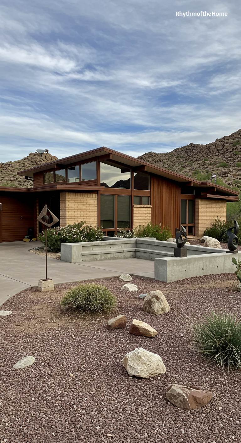 Set against a backdrop of rugged, rocky desert hills, this Mid-Century home is a quintessential example of Arizona modernism. The design features a distinctive, angular roofline and clerestory windows that capture the dramatic landscape. The material palette is perfectly suited to the environment, combining pale tan brick with vertical wood siding. The front yard is a thoughtfully designed xeriscape of red gravel and desert-adapted plants. Abstract metal sculptures add an artistic, sophisticated touch, their fluid forms contrasting with the geometric lines of the house and the organic shapes of the surrounding nature.
