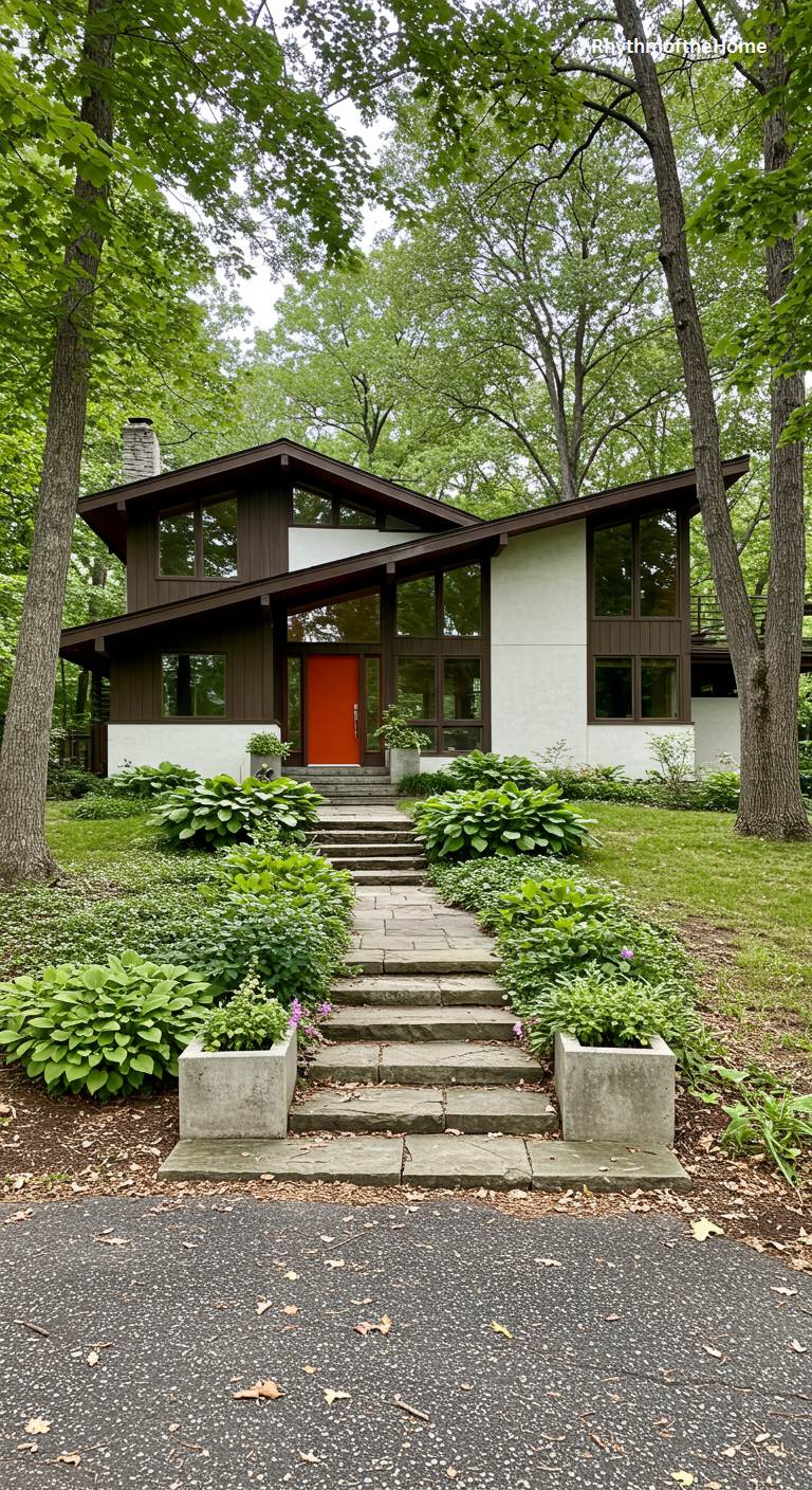 A stone pathway winds up a gentle, verdant slope to the striking entrance of this split-level Mid-Century home. The house is a dynamic composition of intersecting angles and contrasting materials, with clean white stucco playing against dark wood trim and large panes of glass. A vibrant, fiery red-orange front door provides a bold focal point and a welcoming splash of color amidst the lush greenery. The home is nestled amongst mature trees, and the landscape is filled with flourishing hosta plants, creating a private, sanctuary-like feeling that beautifully marries modern design with the natural world.