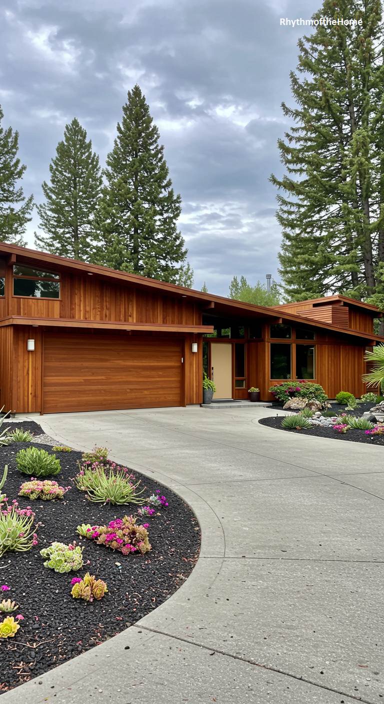 This impressive Mid-Century home showcases the beauty of natural wood and dynamic architectural forms. The entire facade is clad in warm, rich-toned wood, with a low-pitched, angular roofline creating a sense of movement. A gracefully curving concrete driveway sweeps towards the integrated garage and front entrance, its organic shape contrasting beautifully with the home’s clean lines. The landscaping is a work of art, featuring black lava rock as a mulch, which makes the vibrant colors of the succulent plantings pop. This is a home that makes a stunning first impression.