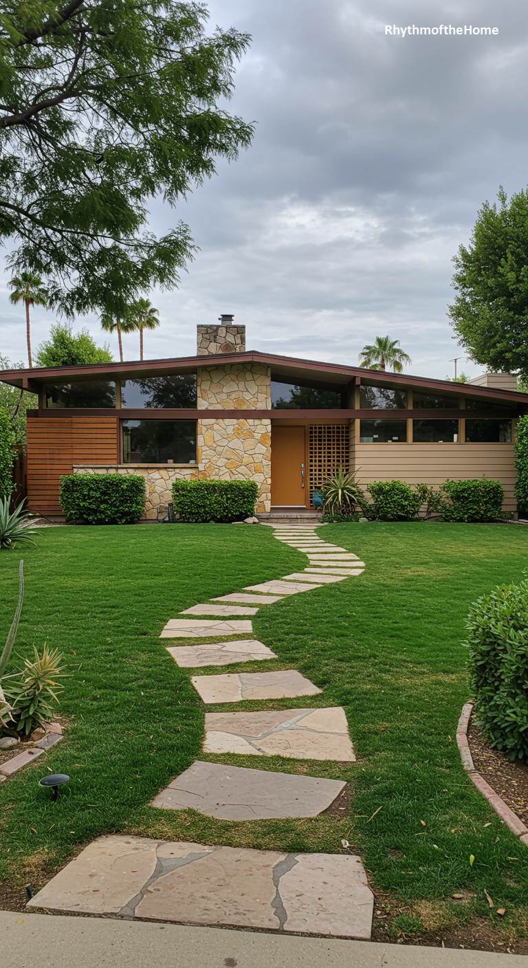 A whimsical, curving path of irregular flagstones meanders across a lush green lawn, leading the eye to this charming Mid-Century ranch. The home itself is a delightful blend of textures and materials, featuring a prominent stone chimney, warm wood accents, and tan siding. The low-pitched, overhanging roof with its exposed beams and clerestory windows is a classic hallmark of the style. The landscaping is kept simple with neatly trimmed hedges and a few agave plants, allowing the unique pathway and the home’s inherent architectural character to take center stage under a cloudy sky.