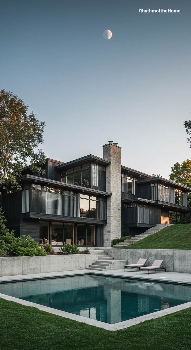 Under the soft glow of a rising moon, this multi-level Mid-Century home is a vision of sophisticated, modern design. The structure is a complex interplay of stacked volumes, combining dark horizontal siding with a towering, light-colored stone chimney that anchors the composition. Vertical slats on the upper balconies add a layer of texture and privacy, creating intricate patterns of light and shadow. A geometric swimming pool in the foreground reflects the serene night sky, its clean lines echoing the architectural precision of the house, which is terraced gracefully into the sloping, grassy hillside.