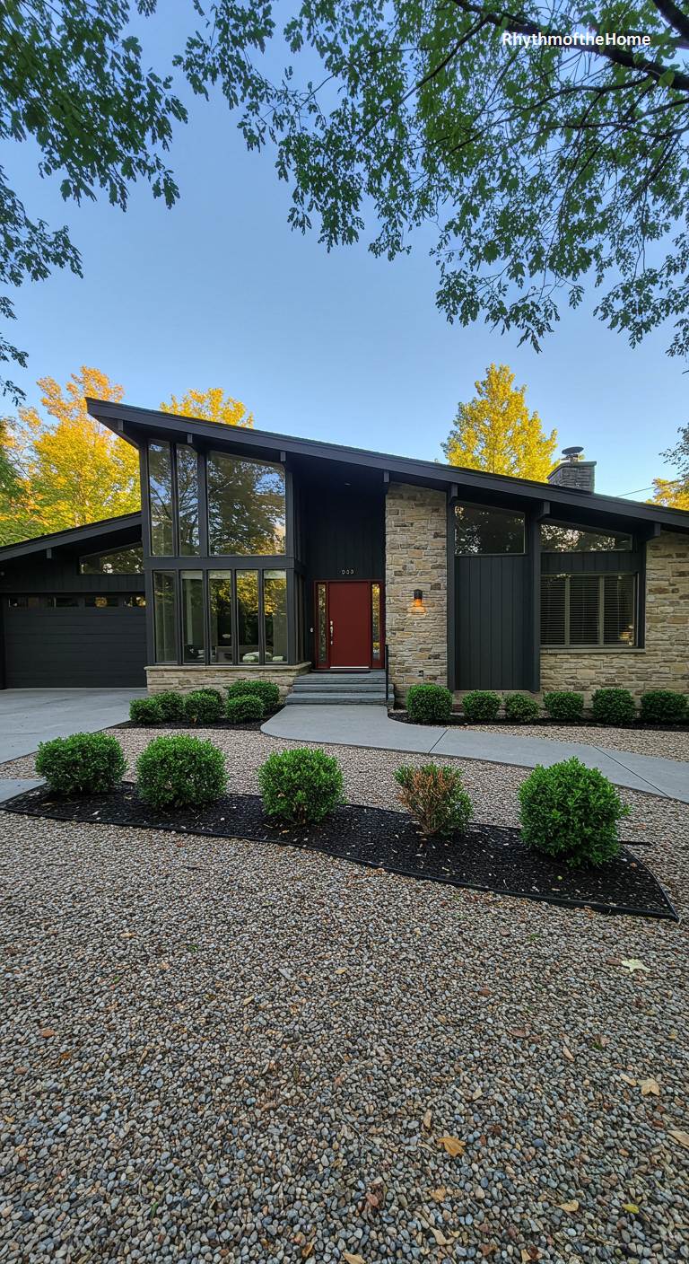 This renovated Mid-Century home makes a powerful contemporary statement with its bold color choices and clean lines. A rich, warm stone veneer and dark, charcoal-colored siding create a sophisticated and textured facade. The focal point is a brilliant red front door, a confident splash of color that injects energy and personality into the design. The home’s distinctive, asymmetric roofline and large, floor-to-ceiling windows are classic period details, now updated for modern living. Neatly manicured shrubs in a bed of dark gravel provide a clean, geometric border to this stylishly updated gem.