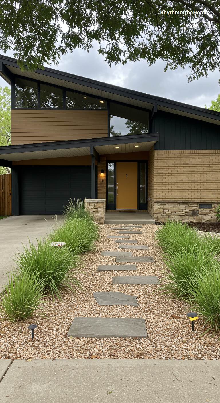 This split-level Mid-Century home presents a friendly and updated face with a thoughtful landscape design. A pathway of rectangular stone pavers is set within a bed of light-colored gravel, flanked by vibrant green ornamental grasses that add softness and texture. The house itself features a pleasing mix of materials, including tan brick, stacked stone accents, and two tones of wood siding. The carport and angled roofline are classic features, while a cheerful mustard-yellow front door adds a playful, welcoming touch to this well-maintained and stylish suburban dwelling.