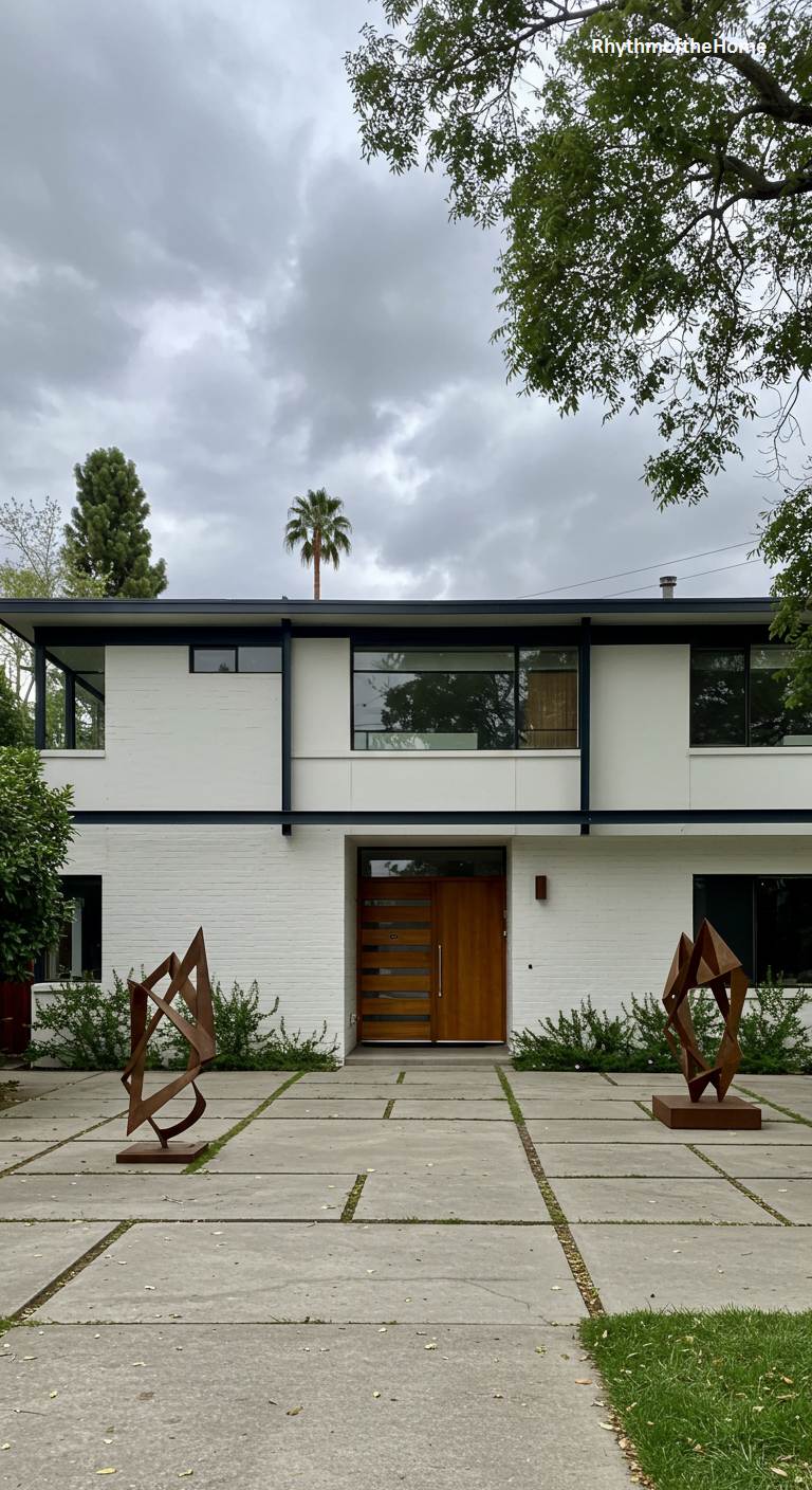 This two-story residence is a powerful example of sculptural, modernist architecture with Mid-Century roots. The facade is a bold composition of white-painted brick and strong, black-painted structural lines that create a graphic, almost Mondrian-like effect. A beautiful, multi-paneled wooden door provides a warm, organic contrast to the crisp, geometric exterior. Two large, abstract rusted metal sculptures stand like sentinels in the concrete driveway, reinforcing the home’s identity as a space where art and architecture converge. A single palm tree peeks over the roofline, hinting at a sunny, Southern California location.