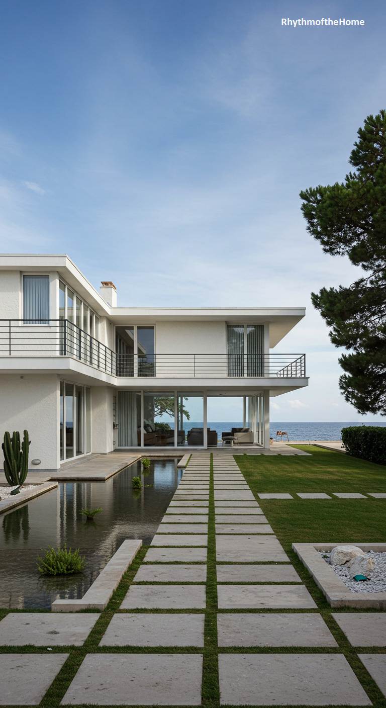 This pristine, white stucco Mid-Century home embodies the clean lines and geometric purity of the International Style, perfectly suited for its seaside location. The multi-level structure features flat roofs, expansive glass windows, and minimalist black railings on the balconies, all designed to maximize the connection to the stunning ocean view. A long, narrow water feature with aquatic plants runs parallel to the house, its dark water reflecting the sky. A pathway of large, square pavers set in a lush green lawn leads the eye towards the sea, creating a sense of elegant, orderly transition from home to nature.