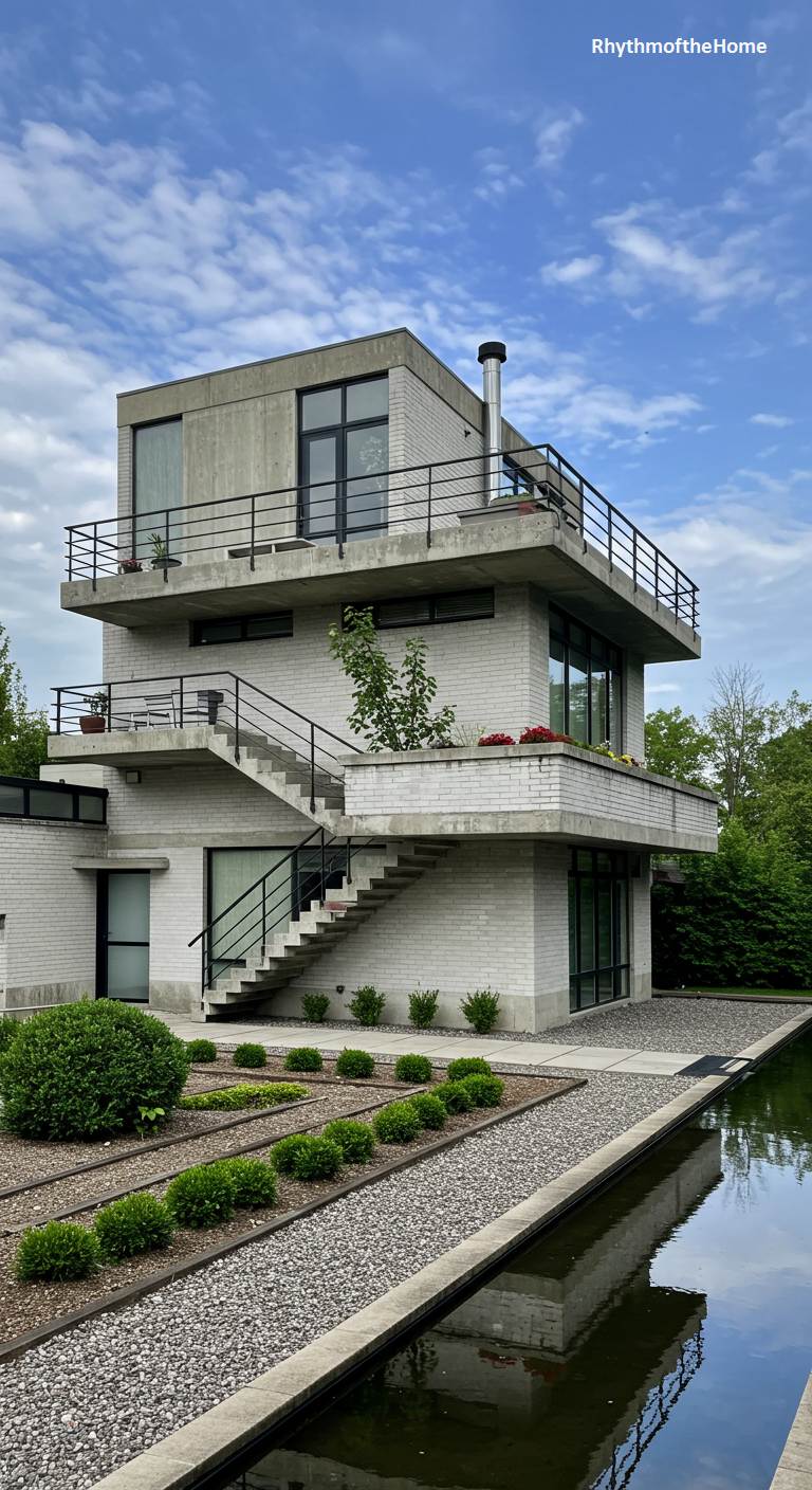 This striking multi-level Mid-Century home showcases a strong Brutalist influence with its use of exposed, board-formed concrete and light-gray brick. The structure is a vertical composition of stacked, cantilevered blocks, creating multiple terraces and a dynamic, sculptural form. Black-framed windows and railings provide a sharp, graphic contrast to the pale masonry. An external staircase elegantly connects the different levels. The home is set beside a tranquil reflecting pool, and the landscaping is a minimalist grid of gravel and neatly planted shrubs, emphasizing the building’s powerful, geometric presence.