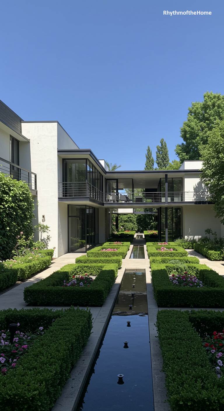 This expansive Mid-Century residence is integrated with a beautifully structured formal garden, creating a feeling of palatial modernism. The home itself features white walls and extensive use of glass, with a covered breezeway connecting two wings of the house. The garden is laid out with geometric precision, featuring long, narrow reflecting pools that act as a central axis. Perfectly manicured boxwood hedges create intricate parterres filled with colorful flowers. This is a space where the clean lines of modern architecture meet the timeless elegance of classical garden design, resulting in a unique and luxurious estate.