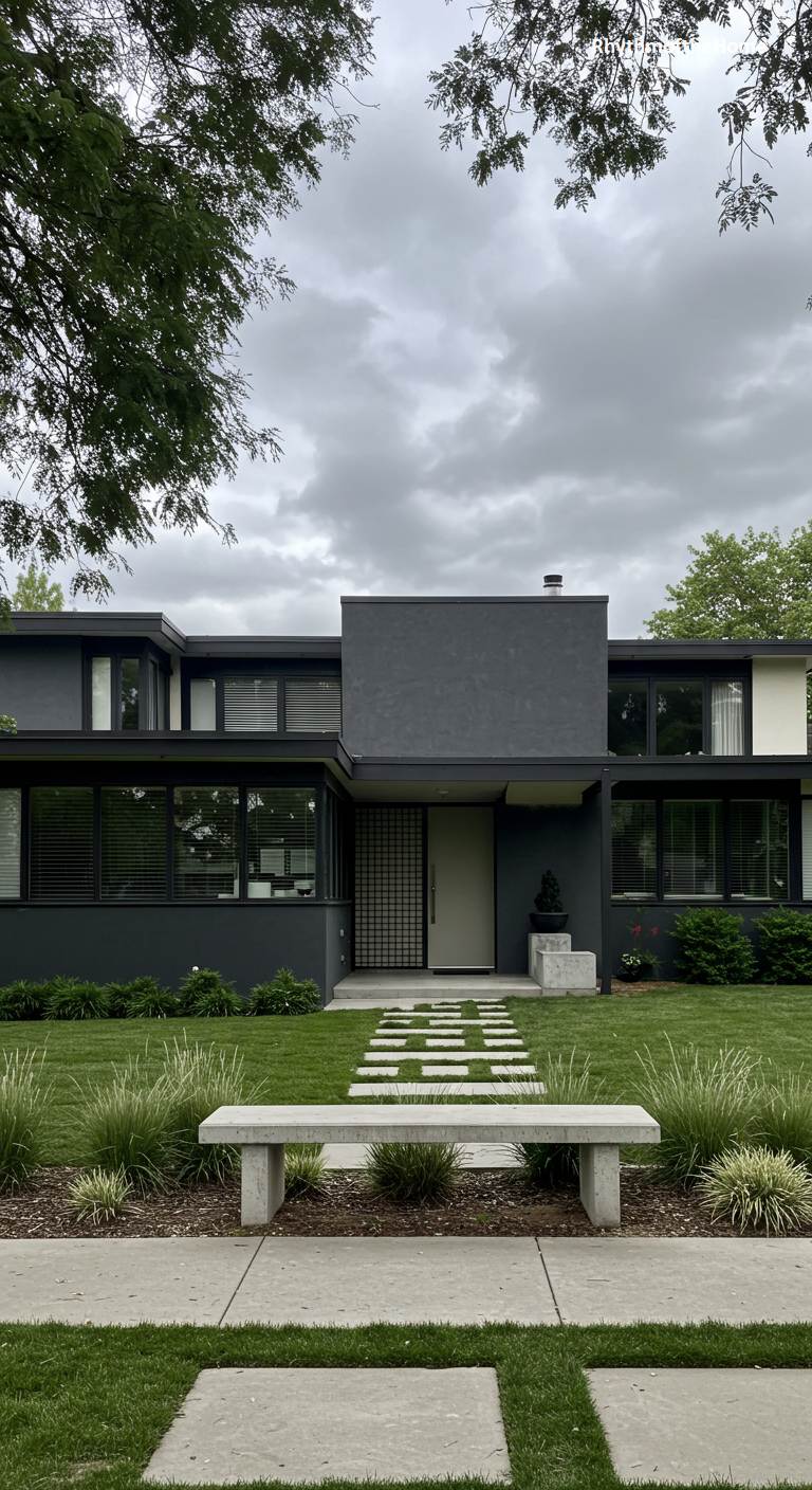 This two-story Mid-Century home makes a bold and sophisticated statement with its dark, monochromatic color scheme. The entire facade is painted a deep, matte charcoal gray, which emphasizes its interesting block-like, asymmetrical form. A lighter-colored, recessed front door offers a subtle point of contrast. A decorative screen with a geometric pattern adds texture and a nod to classic MCM details. The landscaping is minimalist and clean, with a path of white square pavers cutting across the lawn, leading the eye to a simple concrete bench. The overall effect is moody, modern, and undeniably chic.