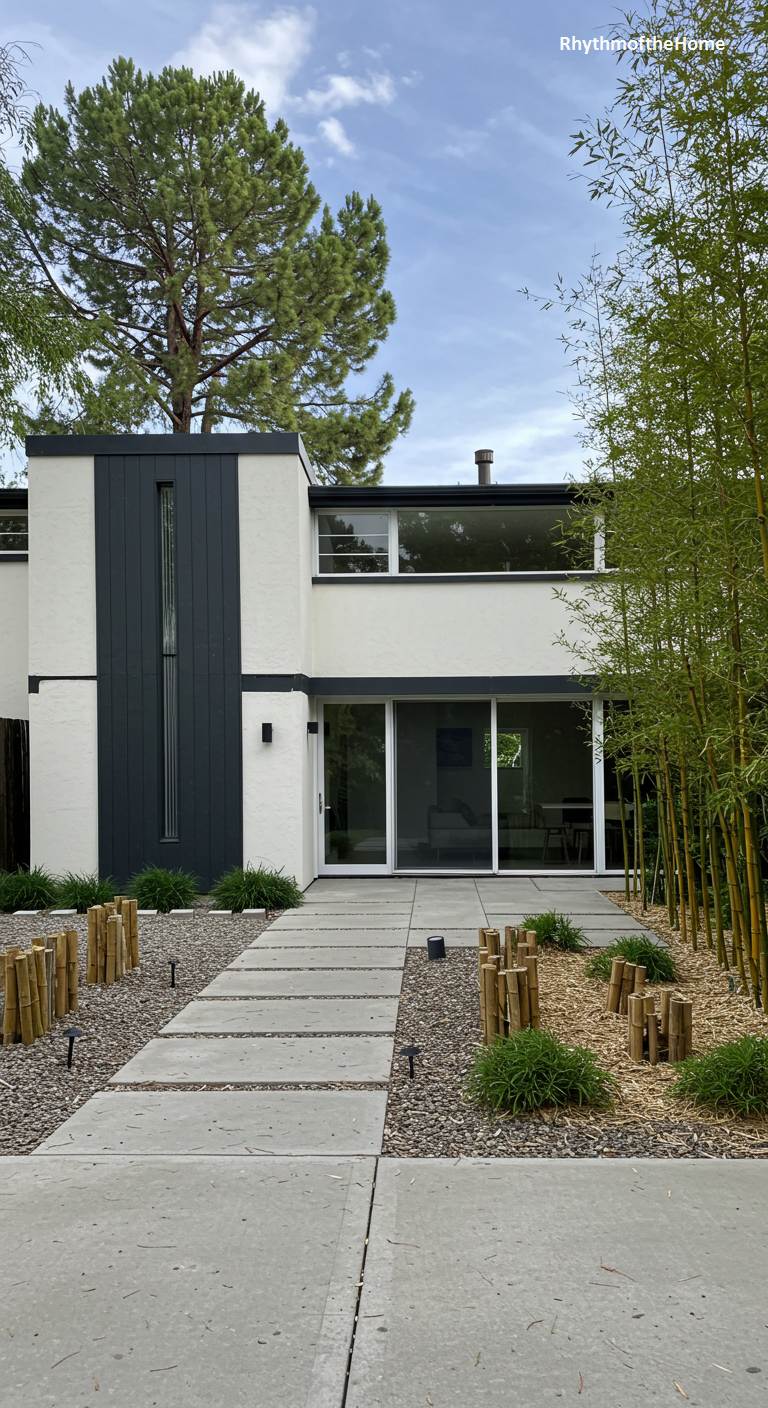 This Mid-Century home beautifully incorporates elements of Japanese Zen design, creating a serene and minimalist aesthetic. The facade combines white stucco with a bold, dark gray vertical panel, creating a strong graphic contrast. A path of large, square concrete pavers leads to the entrance, flanked by gravel beds with artfully placed bamboo stalks, which add a natural, sculptural element. The landscaping is deliberately sparse, focusing on texture and form rather than color. Large sliding glass doors hint at an interior that is equally calm and connected to the tranquil outdoor space.