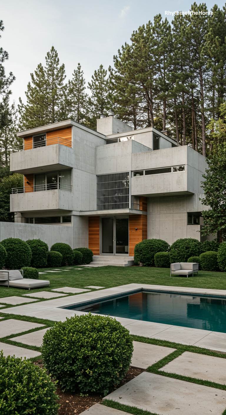 This formidable residence is a masterpiece of modern architecture, heavily influenced by the Brutalist and Mid-Century movements. The structure is composed of raw, exposed concrete, forming a complex series of interlocking blocks and cantilevered balconies. The hardness of the concrete is softened by the strategic use of warm wood for the front door and some exterior panels. A large, geometric swimming pool sits at the base of the structure, its calm, turquoise water reflecting the building’s powerful form. Manicured boxwood spheres dot the lush green lawn, adding a touch of formal softness to the monumental design.