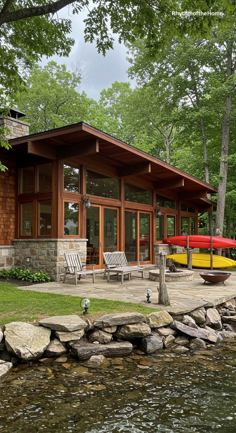 This exquisite lakeside Mid-Century home feels more like a glass pavilion designed for communion with nature. Its structure is defined by strong post-and-beam construction, with floor-to-ceiling windows and sliding doors creating a transparent barrier to the serene waters just steps away. A foundation of natural stone grounds the airy design, which is crowned by a broad, overhanging roof providing shelter to the flagstone patio. Two brightly colored kayaks rest on stands, promising adventure and reinforcing the home’s identity as a stylish launchpad for enjoying the idyllic, tree-lined lakefront setting.