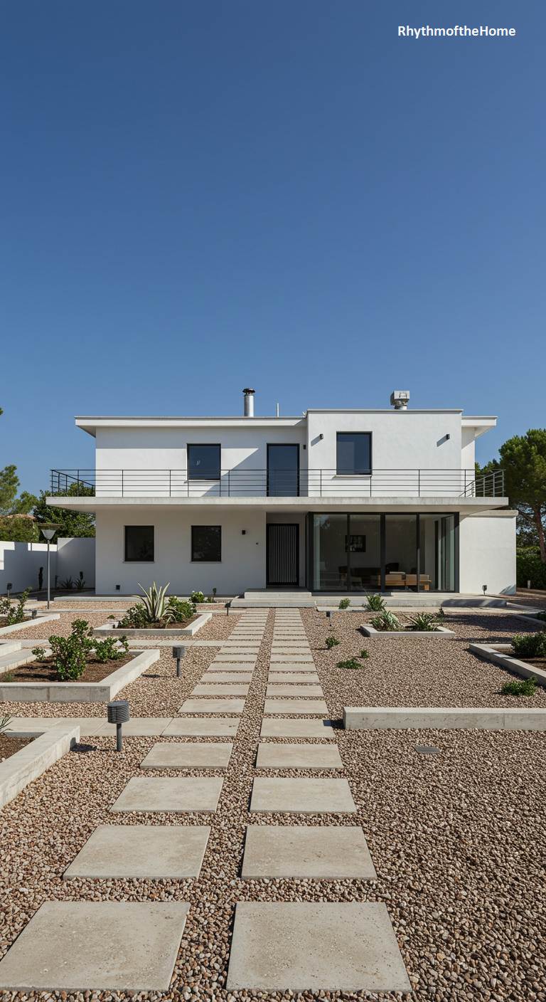 This two-story white stucco Mid-Century home has a distinct Mediterranean feel, with its clean lines, flat roof, and integration with a sun-drenched landscape. Black-framed windows and simple black metal railings provide a crisp, graphic contrast. A path of large, rectangular pavers leads through a xeriscaped garden of gravel and drought-tolerant plants in raised concrete beds. This simple, elegant design is perfectly suited for a warm climate, evoking a sense of relaxed, minimalist luxury. The clear blue sky overhead completes this picture of serene, modern living.