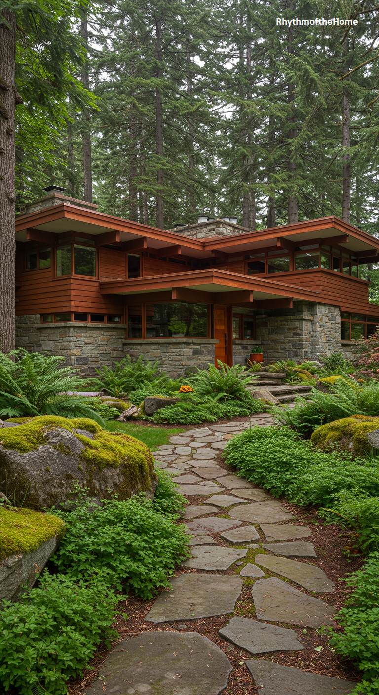 This incredible Mid-Century home, reminiscent of Frank Lloyd Wright’s Usonian principles, appears to grow organically from its lush, forest setting. The multi-level structure is built with a foundation of rough-hewn, local stone and features warm, horizontal wood siding. The complex, low-pitched rooflines with deep overhangs create a dynamic silhouette against the tall trees. A flagstone path winds through a verdant landscape teeming with ferns and moss-covered rocks, leading towards the welcoming, wood-framed entrance. This is a perfect example of architecture that is in deep, respectful harmony with its natural environment.