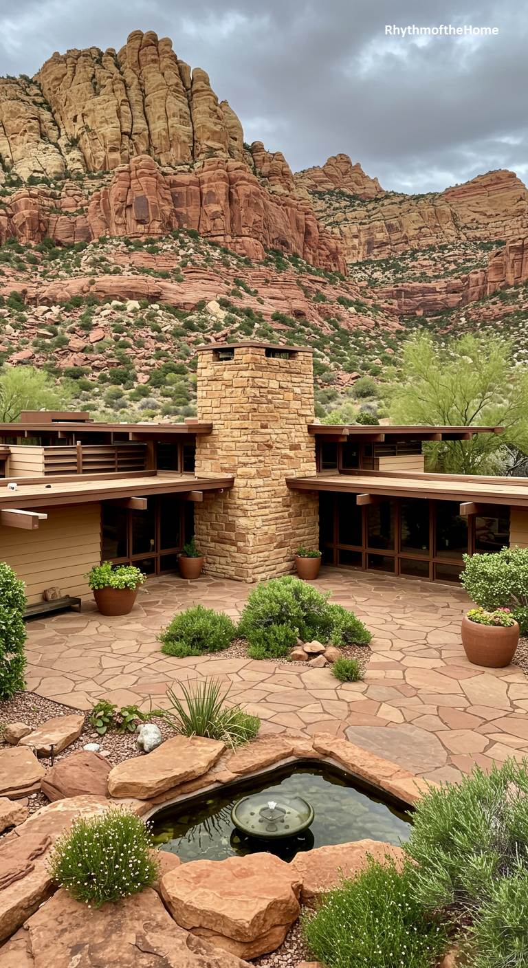 Set against the breathtaking backdrop of Sedona’s majestic red rock formations, this Mid-Century home is a masterful example of desert architecture. Designed by Frank Lloyd Wright apprentice John Rattenbury, the house is organized around a central, open-air courtyard paved with flagstones. The structure itself is low and sprawling, with tan stucco walls and a prominent, angular stone chimney that echoes the colors and textures of the surrounding landscape. A small water feature adds the gentle sound of water to this tranquil, sun-drenched space, creating a perfect sanctuary in the heart of the desert.