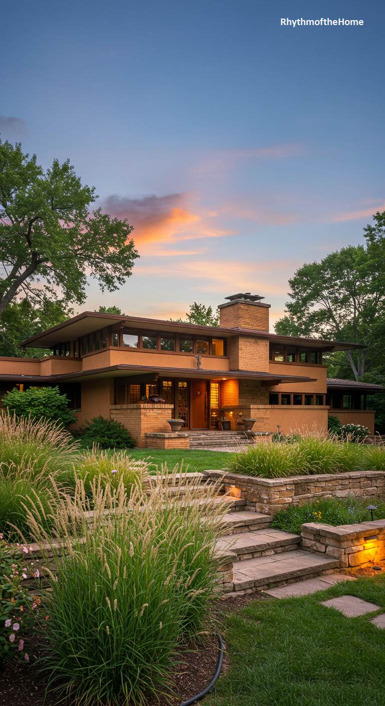 Basking in the warm, painterly glow of a sunset, this stunning Mid-Century home shows the strong influence of Frank Lloyd Wright’s Prairie School style. Its low, horizontal profile, wide overhanging eaves, and central chimney are hallmark features. The house is built with a mix of Roman brick and stucco in warm, earthy tones. The terraced landscape, with its stone retaining walls and abundant ornamental grasses, beautifully integrates the structure into the site. The overall effect is one of profound harmony between the built environment and the natural world, creating a serene and elegant residence.