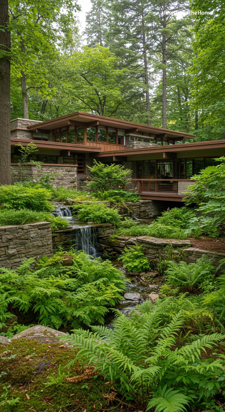This extraordinary Mid-Century home is built into a lush, wooded hillside, with a stunning water garden as its centerpiece. A series of stone-walled terraces creates multiple levels for waterfalls to cascade gently through a landscape overflowing with vibrant green ferns. The house itself, with its wood and stone construction and multiple levels, seems to be a part of this natural watercourse. Bridges and pathways cross over the stream, further integrating the living spaces with the serene, dynamic garden. This is a true sanctuary where architecture and nature are not just adjacent, but completely intertwined.